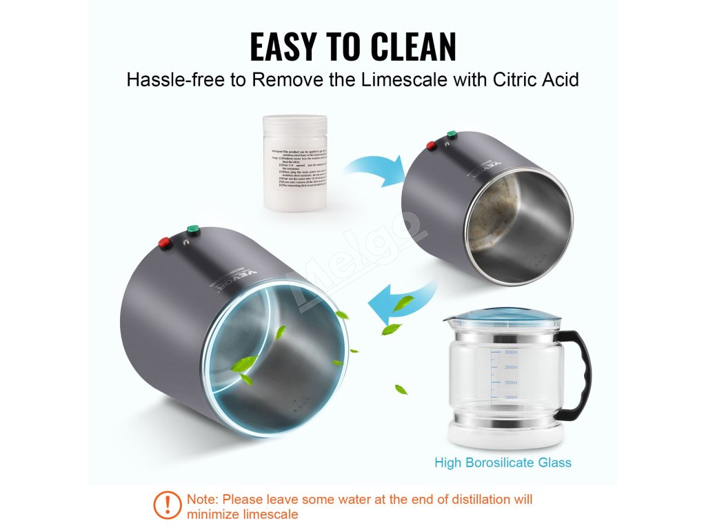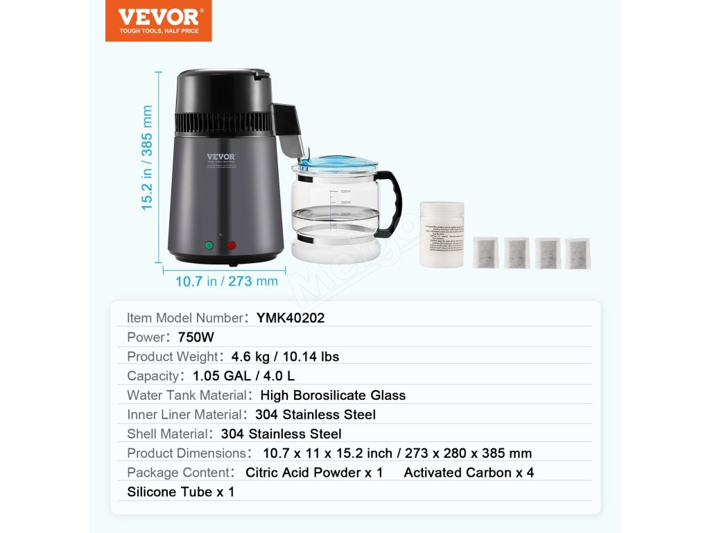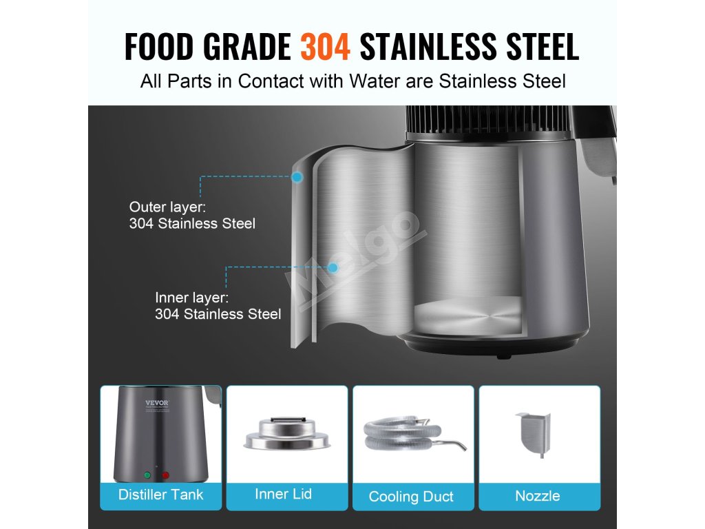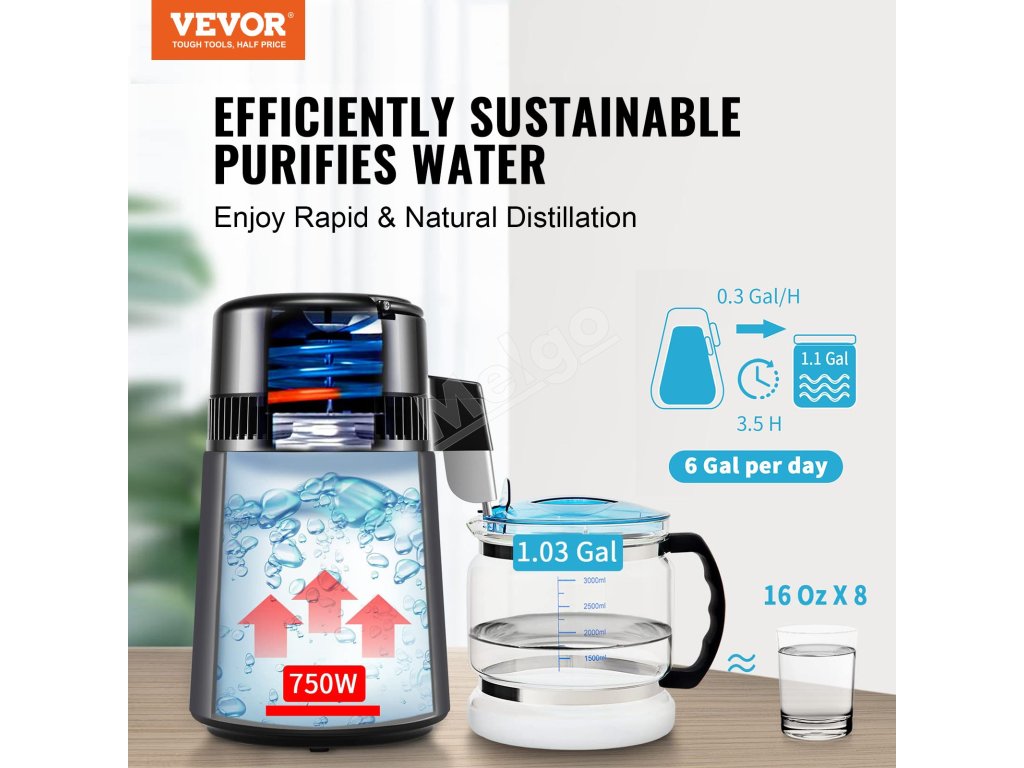 Destilátor vody s výkonom 750 W produkuje viac ako 0,26 GAL/1 l vody za hodinu a má kapacitu destilovať 6,3 GAL/24 l denne. Je vyrobený z nerezovej ocele 304 vhodnej pre styk s potravinami, chráni vaše zdravie a zabezpečuje konzistentný prísun destilovanej vody.