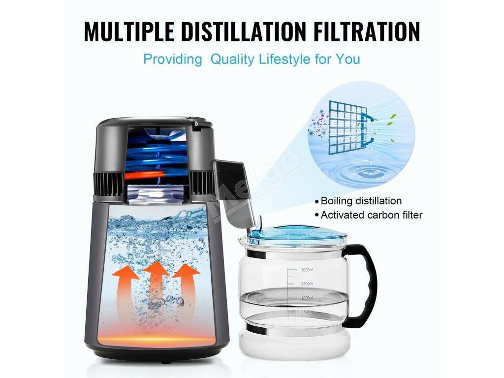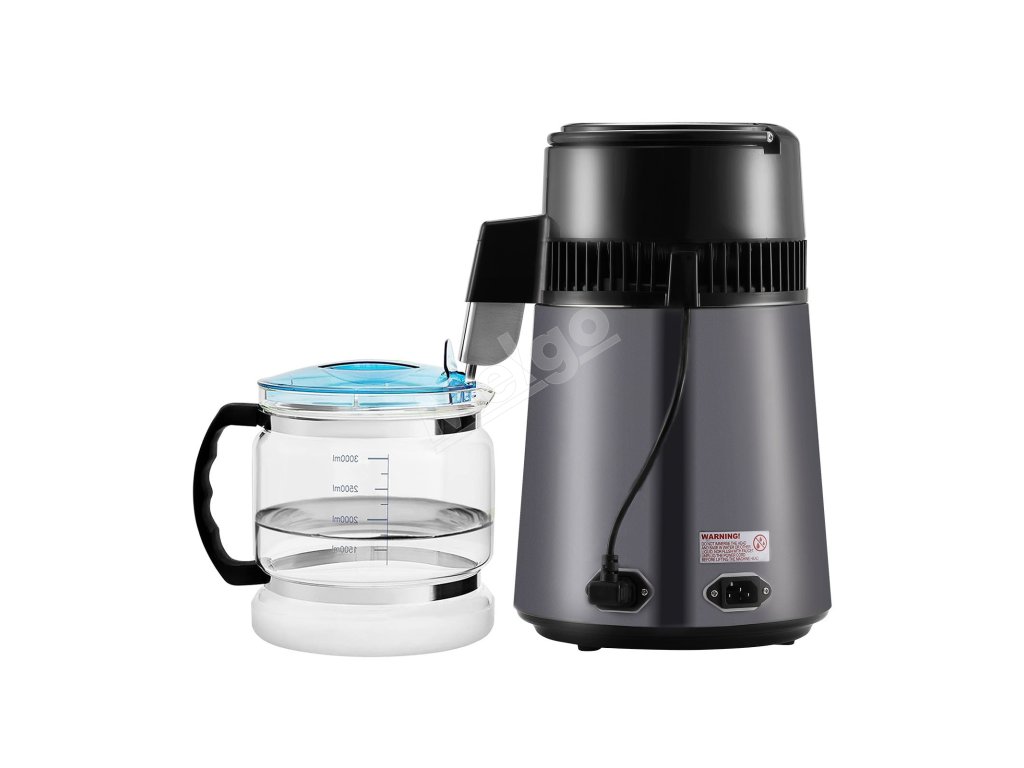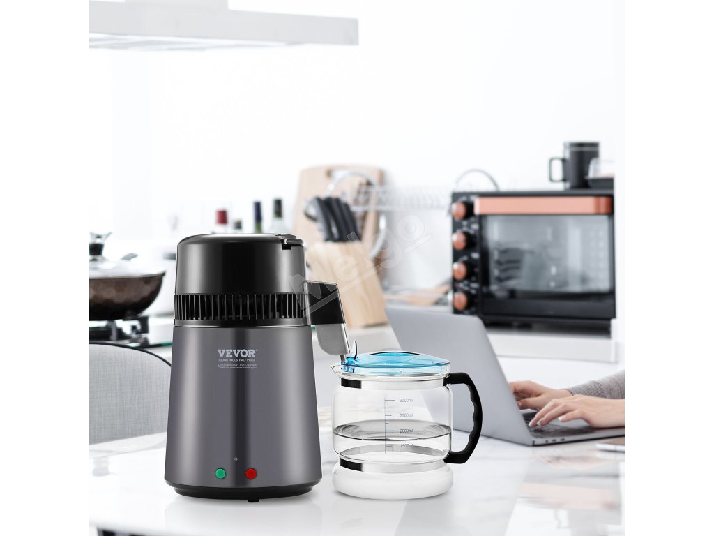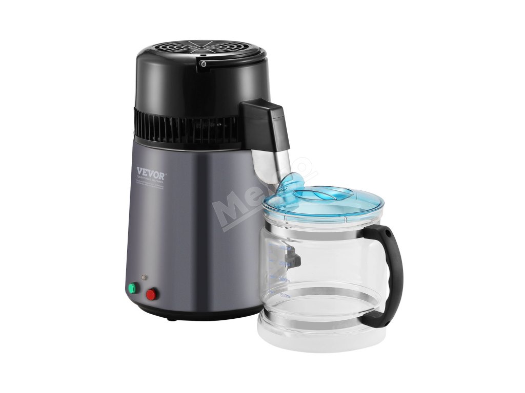 Destilátor vody s výkonom 750 W produkuje viac ako 0,26 GAL/1 l vody za hodinu a má kapacitu destilovať 6,3 GAL/24 l denne. Je vyrobený z nerezovej ocele 304 vhodnej pre styk s potravinami, chráni vaše zdravie a zabezpečuje konzistentný prísun destilovanej vody.