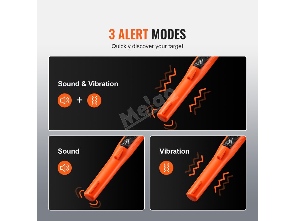 Náš detektor kovov je vybavený 3 režimami, ktoré uspokoja vaše potreby pri prieskume. Zvukový režim funguje najlepšie na súši, vibračný režim je vhodný na prieskum pod vodou s obmedzeným zorným poľom. Režim zvuk + vibrácie funguje dobre v hlučnom prostredí.