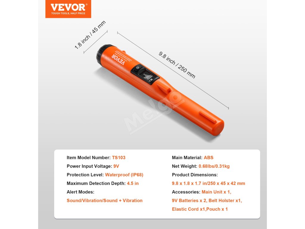 Pinpointer vodotesný ip68 114mm/4.5" dosah 3 režimy lcd s puzdrom a 9V