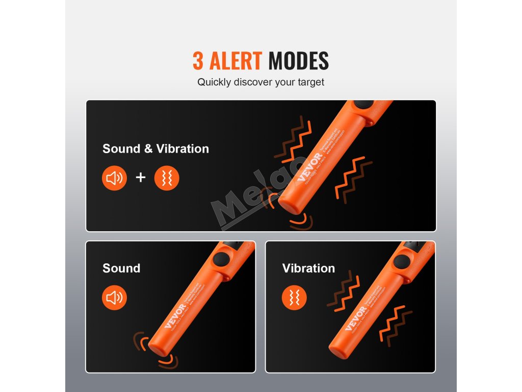 Náš detektor kovov je vybavený 3 režimami, ktoré uspokoja vaše potreby pri prieskume. Zvukový režim funguje najlepšie na súši, vibračný režim je vhodný na prieskum pod vodou s obmedzeným zorným poľom. Režim zvuk + vibrácie funguje dobre v hlučnom prostredí.