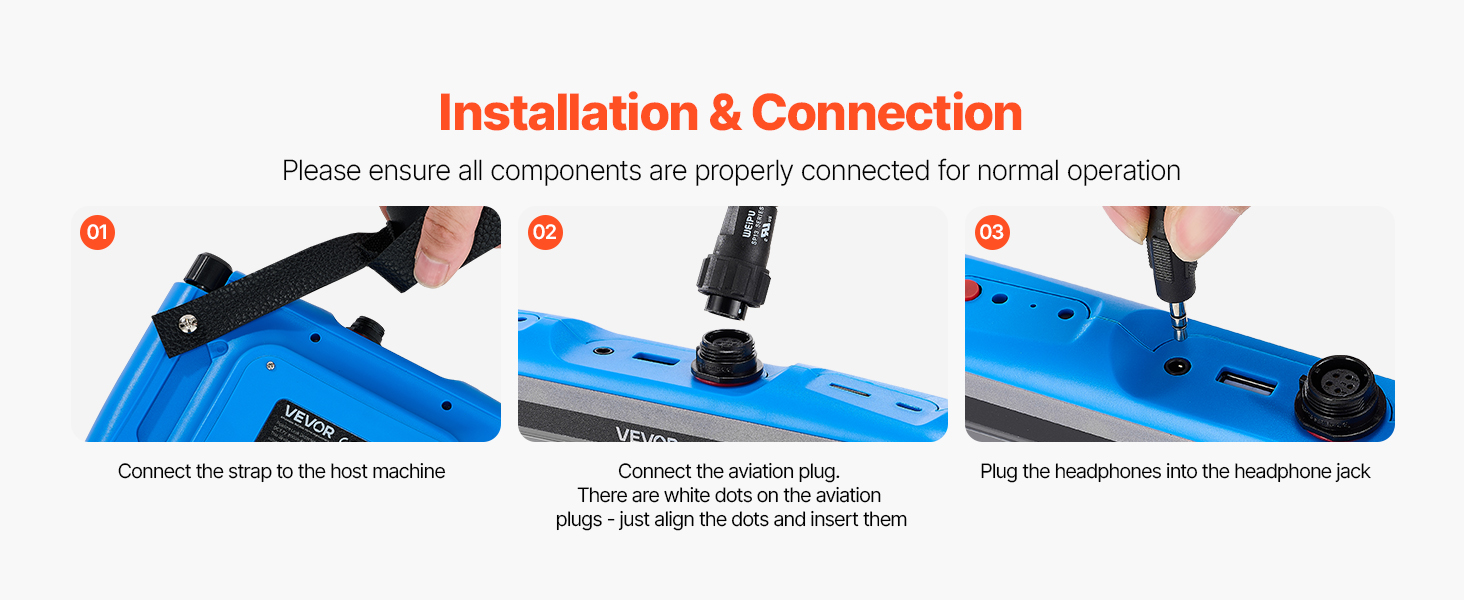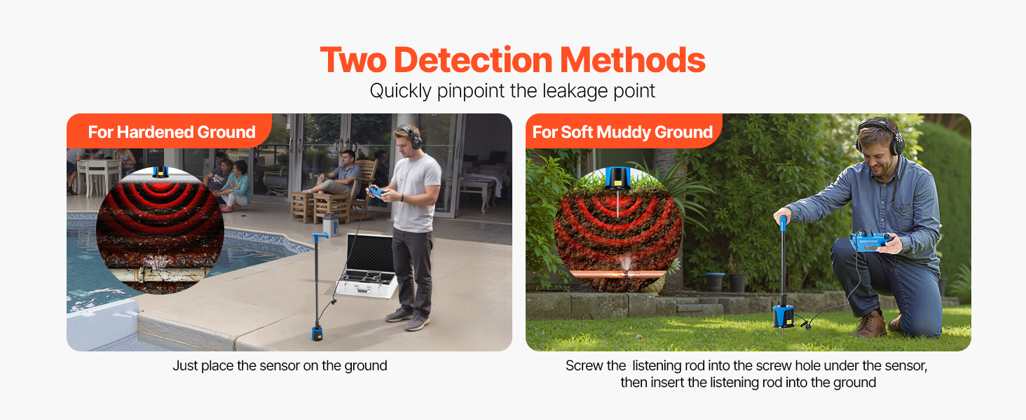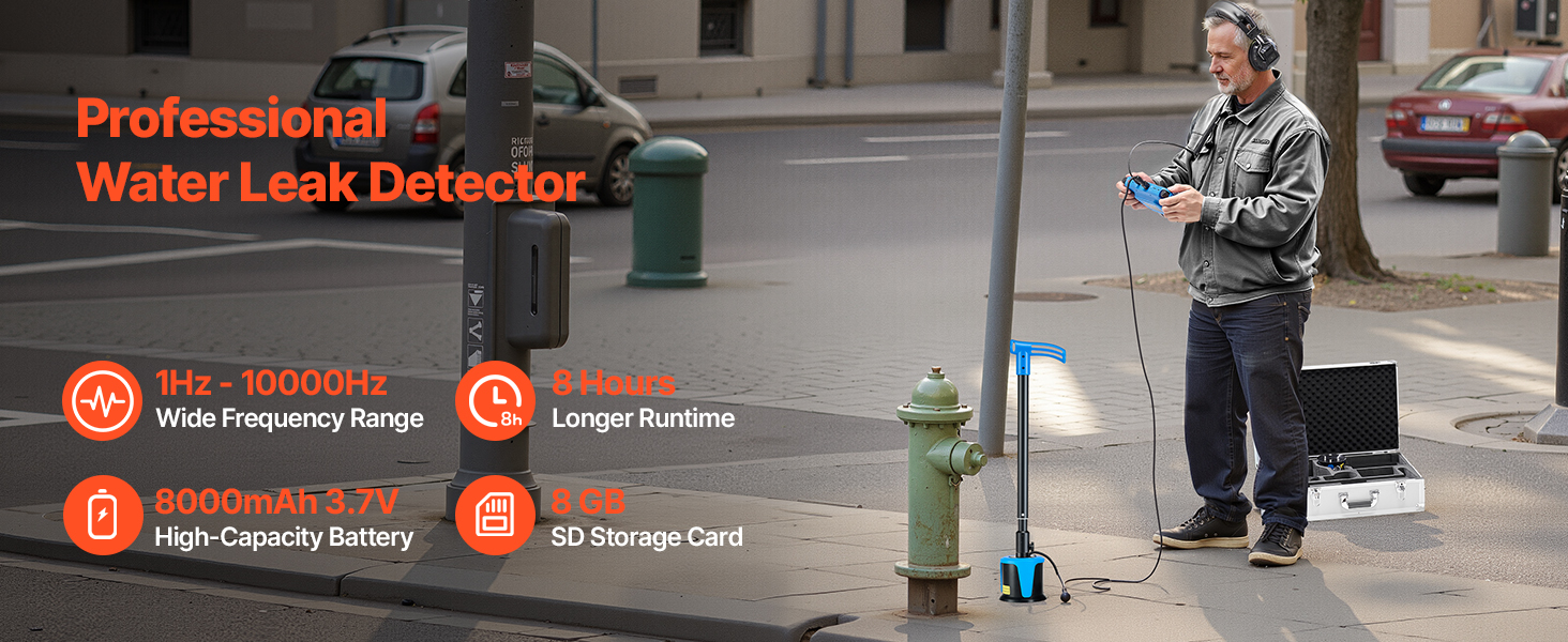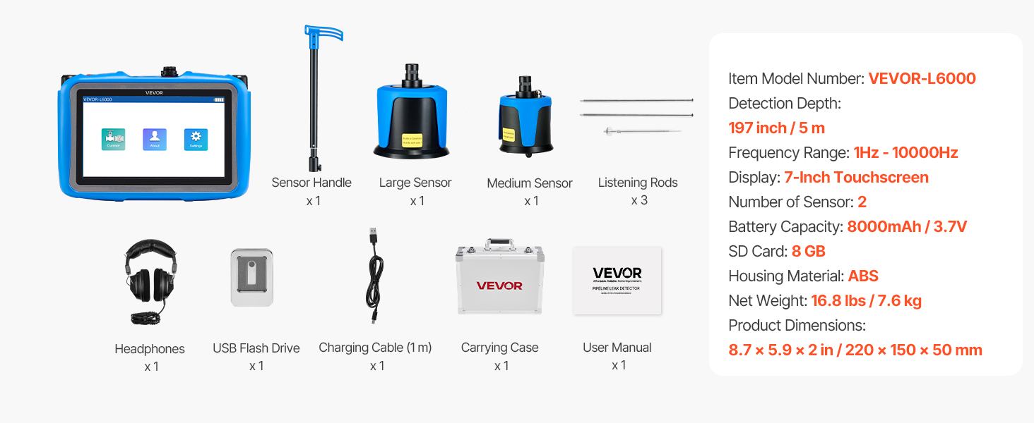 Detektor úniku vody z potrubia VEVOR poskytuje široký frekvenčný rozsah 1 Hz - 1 000 Hz a hĺbku detekcie 16,4FT (5 m). Je vybavený strednými a veľkými snímačmi, 3 počúvacími tyčami, slúchadlami s potlačením hluku, 7-palcovým dotykovým displejom a vysokokapacitnou batériou s kapacitou 8000 mAh na efektívne zisťovanie úniku vody z vonkajšieho potrubia.