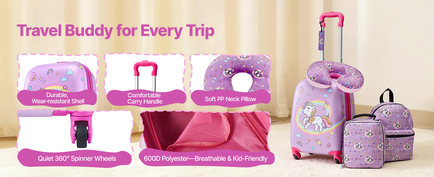 Táto 5-dielna detská batožinová sada spĺňa požiadavky na príručnú batožinu a uľahčuje cestovanie. Odolný povrch, prehľadné priehradky, nastaviteľná rukoväť a hladké otočné kolieska pomáhajú deťom efektívne baliť a s istotou sa pohybovať.
