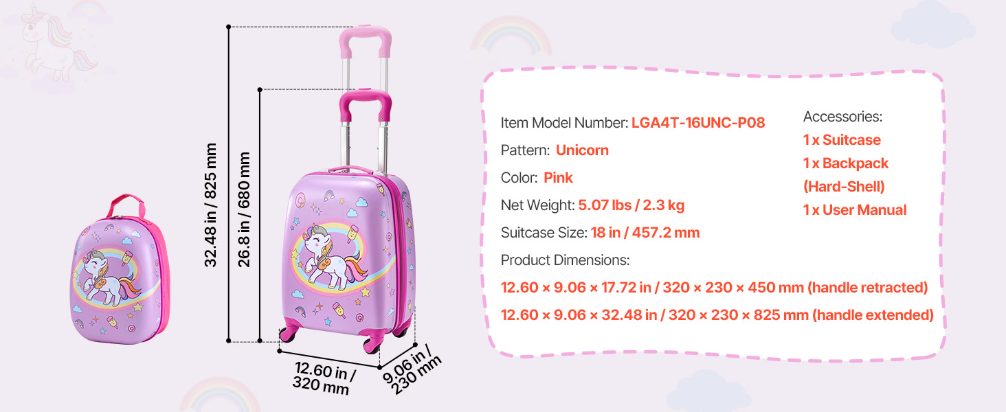 Detský kufor s batohom, 2-dielny, 45.7 cm, kolieska, jednorožec