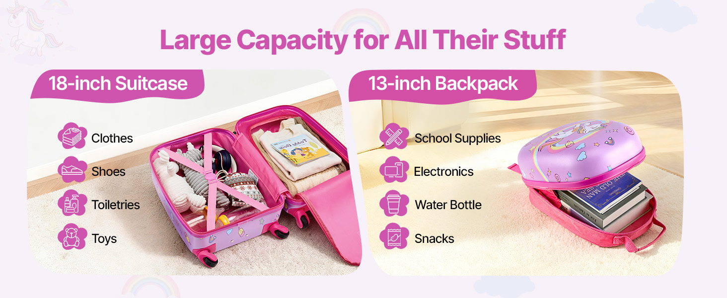 18-palcový detský kufrík pojme oblečenie, topánky, toaletné potreby a hračky. 13-palcový batoh pojme školské potreby, elektronické zariadenia, fľašu na vodu a desiatu. Vaše dieťa bude mať na cestách a počas rušných dní všetko poriadne usporiadané.