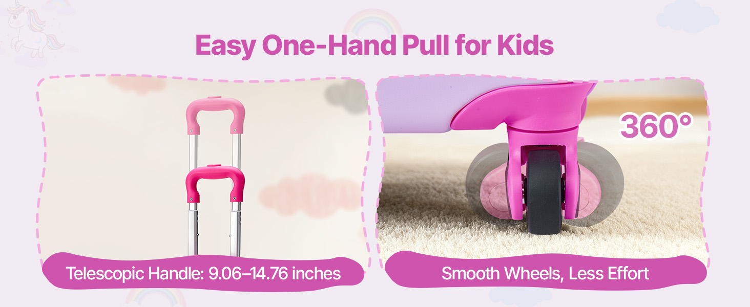 Teleskopická rukoväť batožiny pre batoľatá sa prispôsobí rastúcim cestovateľom. Kolesá sa otáčajú s menšou námahou a jednoduchý dizajn otvárania a zatvárania umožňuje deťom spravovať svoju tašku ako profesionáli.