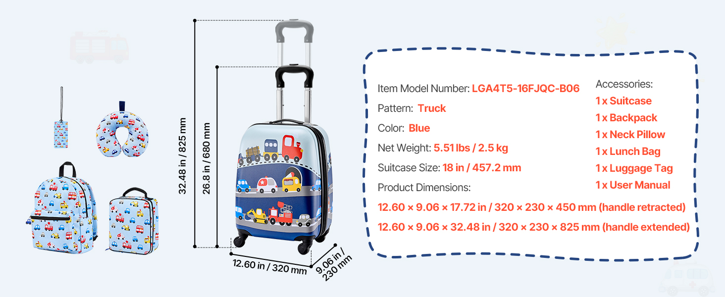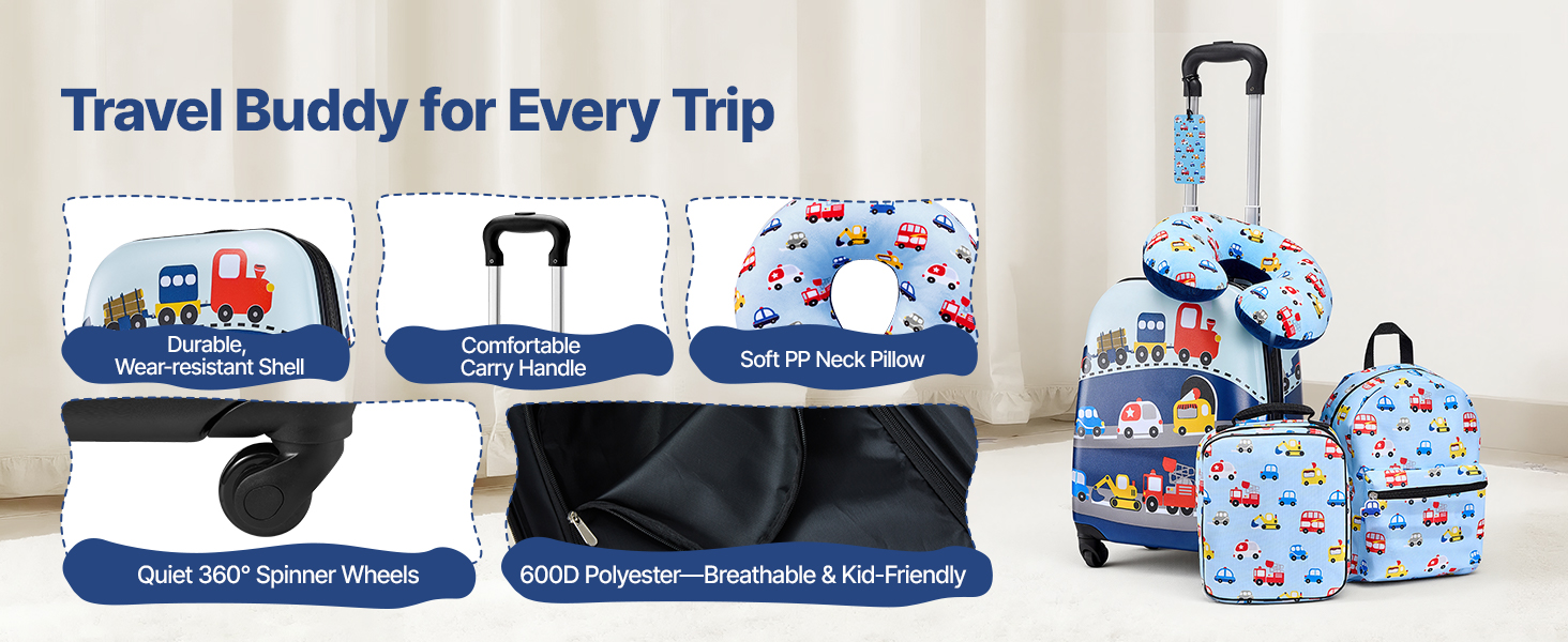 Táto 5-dielna detská batožinová sada spĺňa požiadavky na príručnú batožinu a uľahčuje cestovanie. Odolný povrch, prehľadné priehradky, nastaviteľná rukoväť a hladké otočné kolieska pomáhajú deťom efektívne baliť a s istotou sa pohybovať.