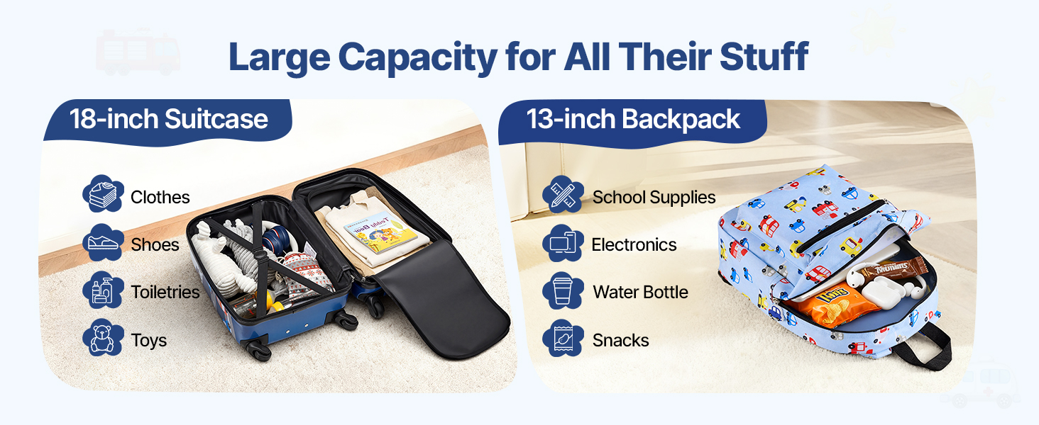 18-palcový detský kufor na kolieskach pojme oblečenie, topánky, toaletné potreby a hračky. 13-palcový batoh pojme školské potreby, elektronické zariadenia, fľašu na vodu a desiatu. Vaše dieťa bude mať na cestách a počas rušných dní všetko poriadne usporiadané.