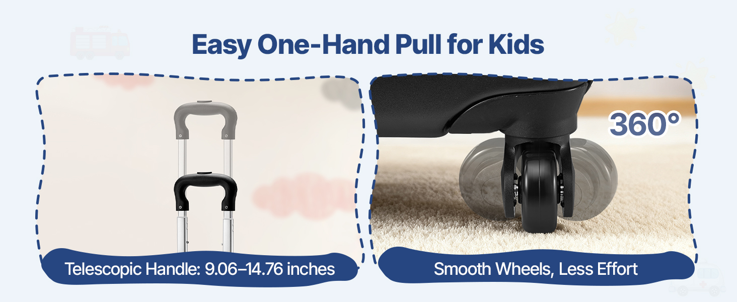 Teleskopická rukoväť batožiny pre batoľatá sa prispôsobí rastúcim cestovateľom. Kolesá sa pohybujú s menšou námahou a jednoduchý dizajn otvárania a zatvárania umožňuje deťom spravovať svoju batožinu ako profesionáli.