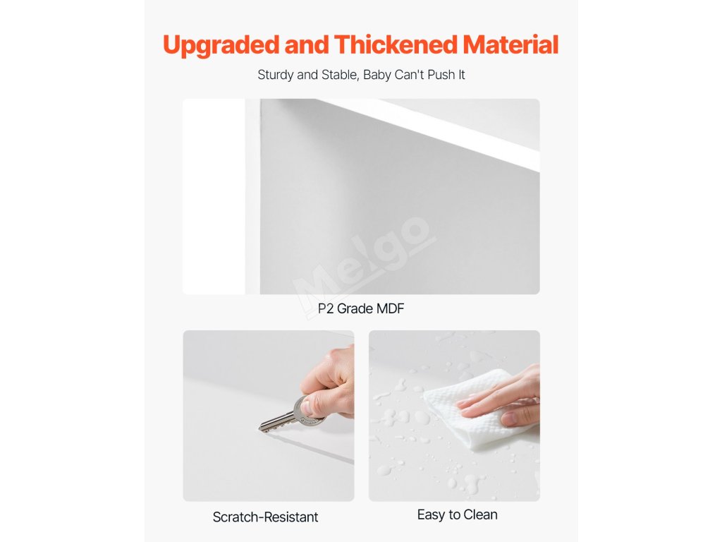 Táto detská úložná skrinka je vyrobená z hrubej MDF dosky triedy P2 a je vyleštená do hladka bez ostrých hrán a nerovností. Neobsahuje chemikálie a je bez zápachu, čím poskytuje bezpečné prostredie na hranie pre vaše dieťa.
