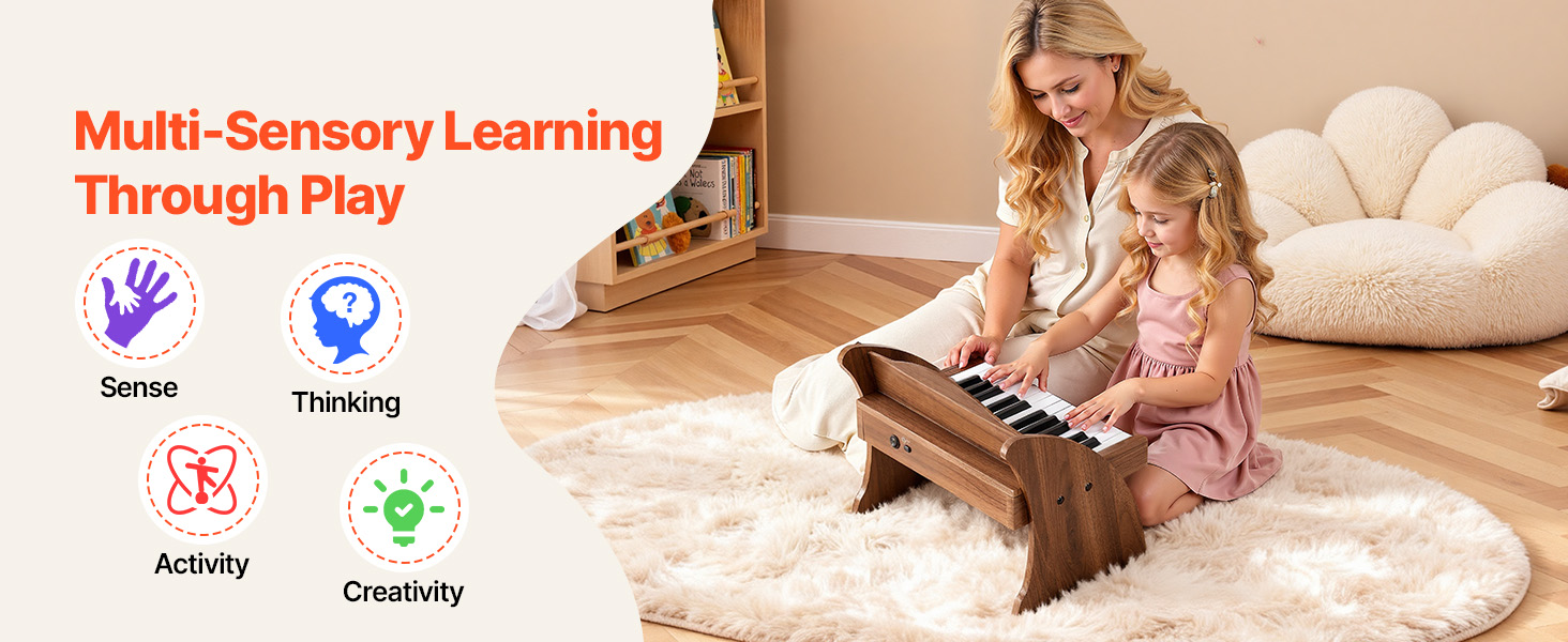 Keď deti objavujú hudbu prostredníctvom dotyku, zvuku a pohybu, učenie je pre ne prirodzené. Toto drevené detské klavír podporuje prirodzenú interakciu, hru sólo, hru s priateľmi alebo čas strávený s rodičmi, čím pomáha rozvíjať hudobné porozumenie uvoľneným a radostným spôsobom.