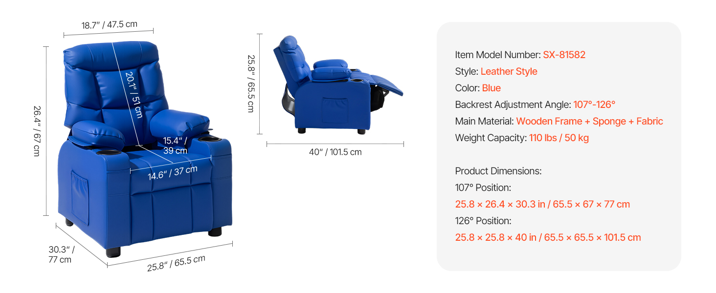 Detské polohovateľné kreslo 107°–126° s 2 držiakmi, 4 vreckami, PU