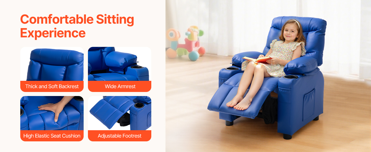 Kreslo je navrhnuté pre každodenný oddych a obsahuje hrubé operadlo, široké polstrované podrúčky, oporný vankúš a vysúvateľnú opierku na nohy, čím deťom ponúka útulný a príjemný zážitok zo sedenia.
