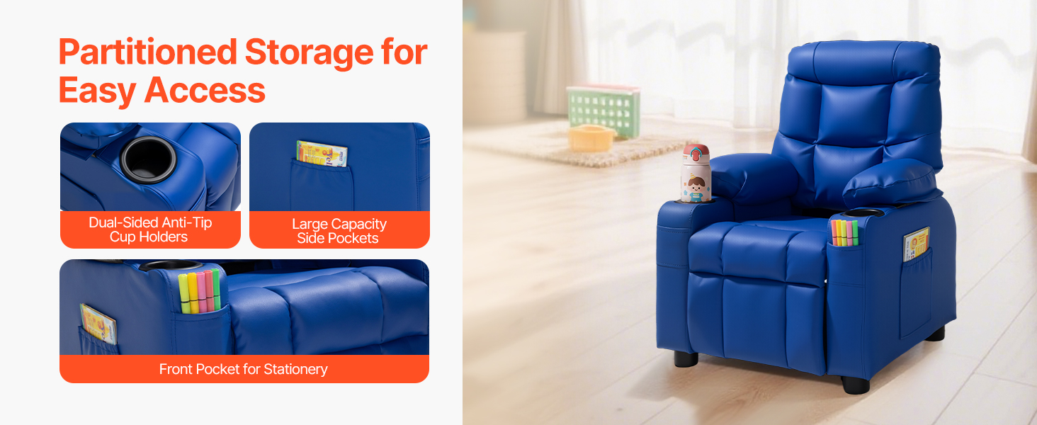 Toto kreslo je vybavené nárazuvzdornými držiakmi na poháre na oboch stranách, ktoré bezpečne udržia nápoje. Priestranné bočné vrecko slúži na odkladanie kníh alebo hračiek, zatiaľ čo menšie predné vrecko pohodlne pojme perá a písacie potreby.