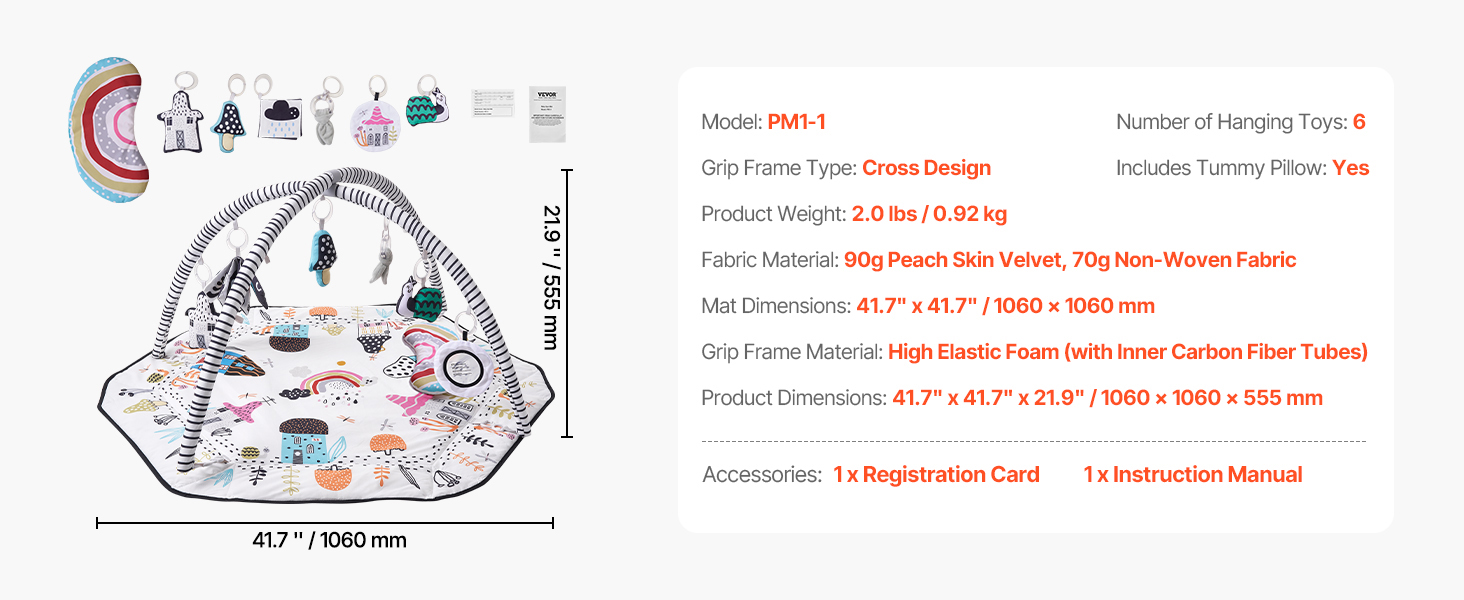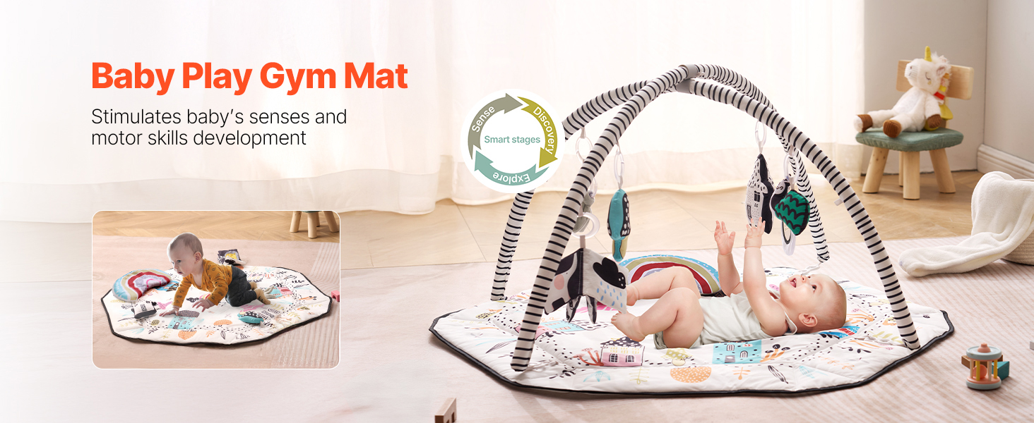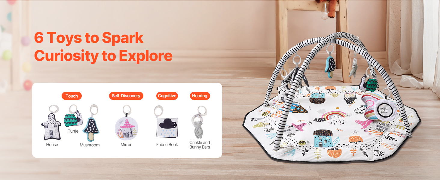 Naša podložka na hranie je nevyhnutná na rozvoj zmyslových a motorických schopností dieťaťa. 41.veľká podložka na hranie s rozmermi 7" x 41,7" sa dodáva so 6 senzorickými hračkami - ideálna pre bábätká v poznávacej fáze. Pomáha im vnímať, objavovať a skúmať svet, zlepšovať kognitívne zručnosti a podporovať rast.