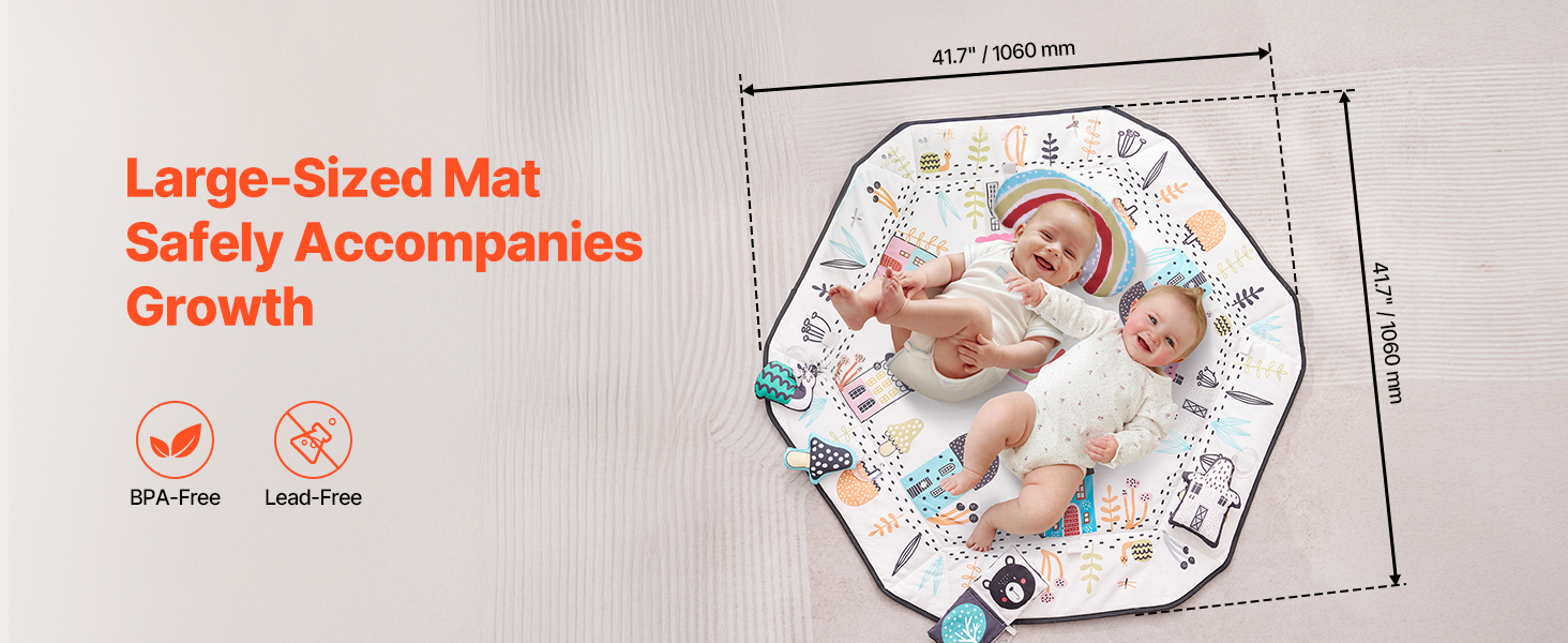 Táto veľká podložka na hranie na brušku s rozmermi 41,7" x 41,7" ponúka dostatok priestoru a bezpečne sprevádza rast vášho dieťaťa. Je vyrobená z materiálov bez obsahu BPA a olova, čím zaručuje zdravie a bezpečnosť vášho dieťaťa a poskytuje rodičom väčší pokoj.