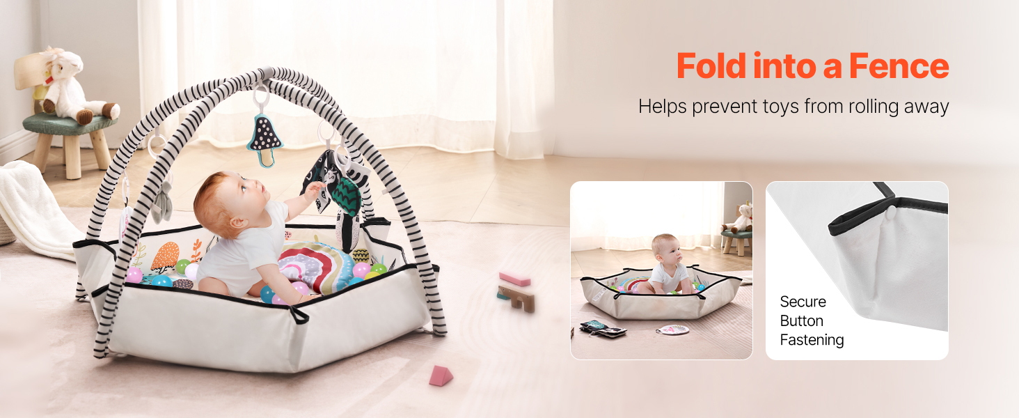Naša podložka na hranie pre bábätká je vybavená sklopnými bočnými stranami, ktoré môžu tvoriť bezpečnostnú ohrádku, čím sa zabráni kotúľaniu hračiek do iných častí domu. Bezpečné zapínanie na gombíky zaisťuje, že ohrádka zostane stabilná a poskytne dieťaťu bezpečný priestor na hranie.
