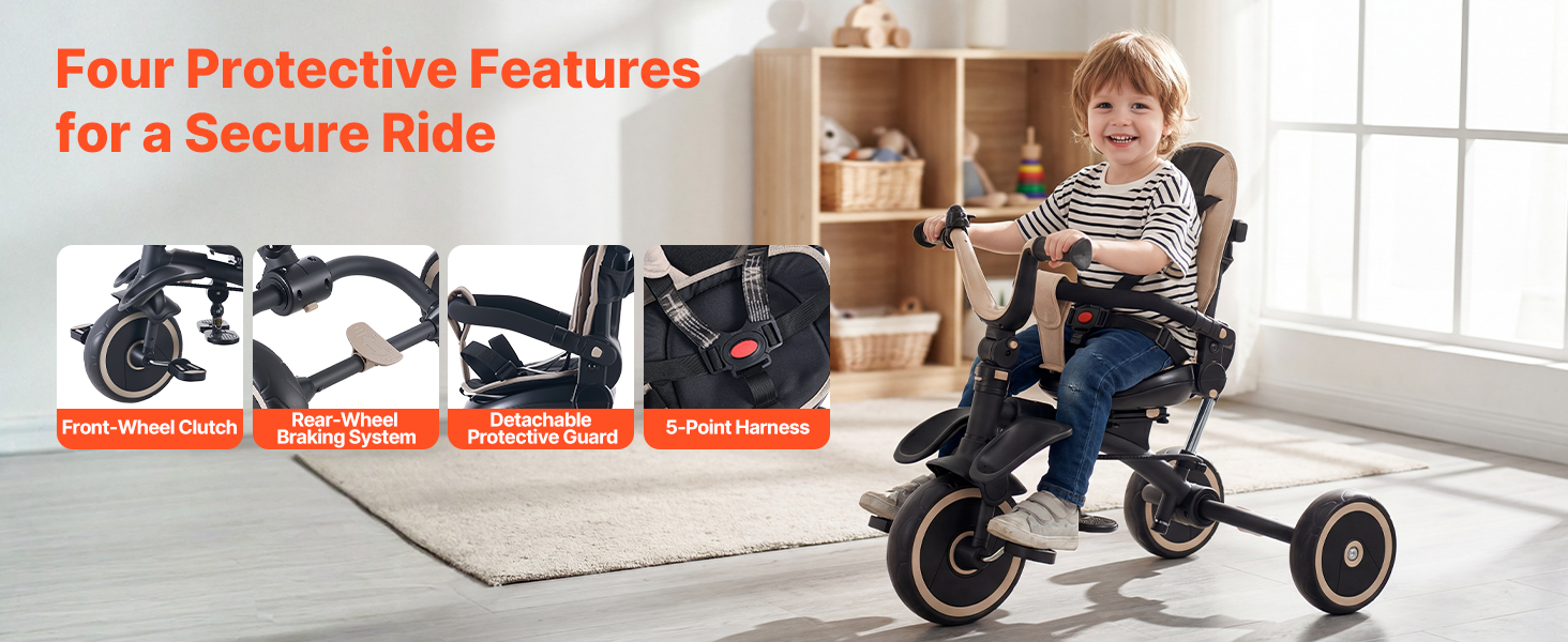 Dvojitý bezpečnostný systém so spojkou na prednom kolese a brzdou na zadnom kolese, plus ochranná lišta a 5-bodový bezpečnostný pás pre dvojitú ochranu – vaše dieťa bude v bezpečí pri každej jazde.