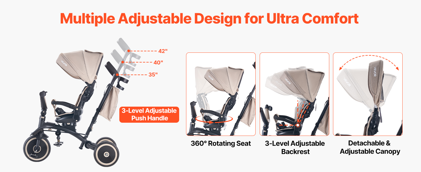 Sedadlo sa dá otočiť o 360° a operadlo je nastaviteľné, takže deti rôznej výšky si môžu nájsť pohodlnú polohu na sedenie. Rukoväť na tlačenie má 3 nastavenia výšky pre ľahké a bez námahy tlačenie.