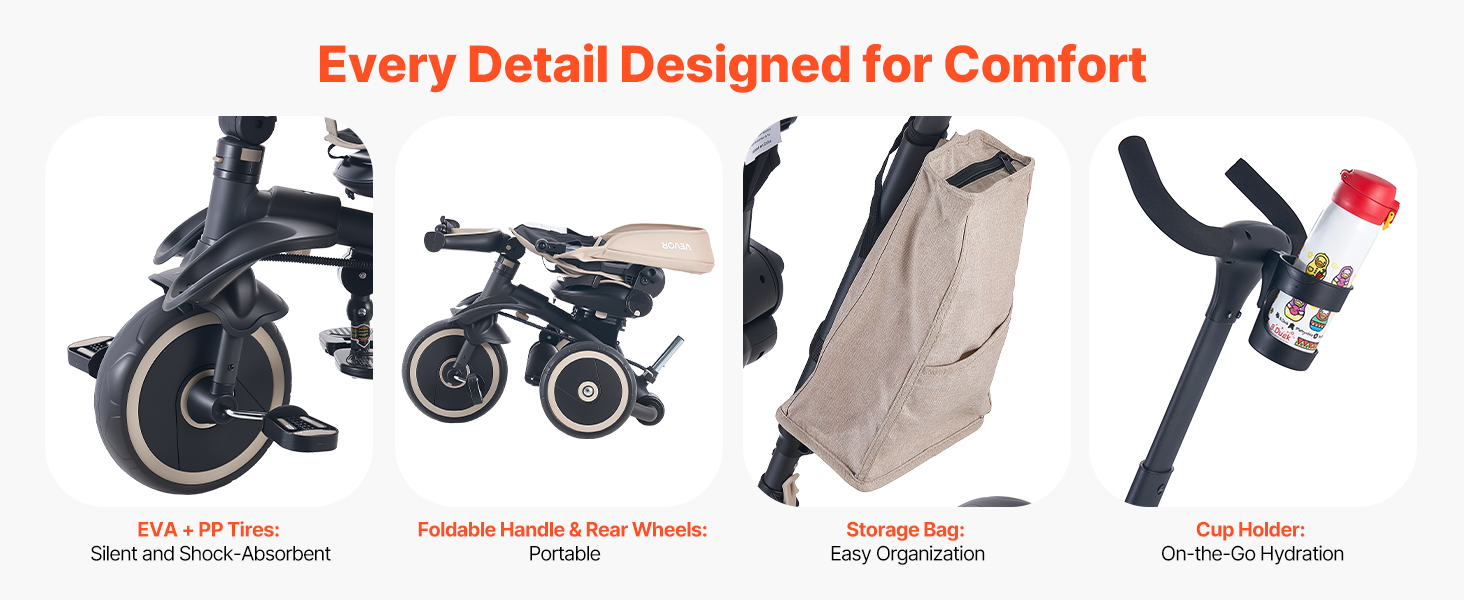Pneumatiky sú vyrobené z EVA + PP pre tichú jazdu s tlmením nárazov, sú tiež vybavené úložnou taškou a držiakom na poháre, aby boli drobné nevyhnutné veci vždy po ruke.