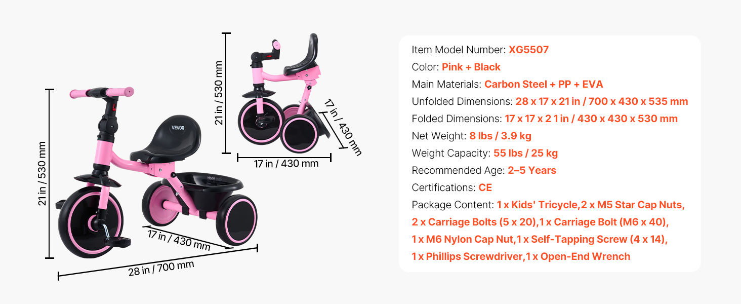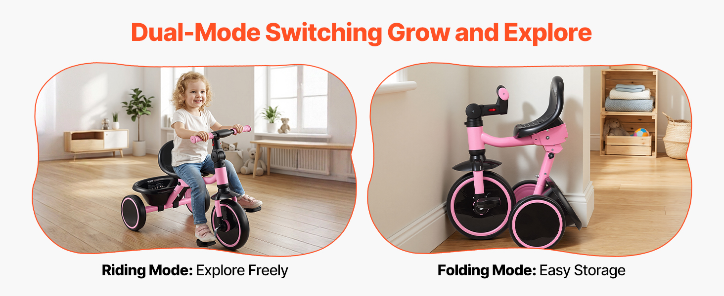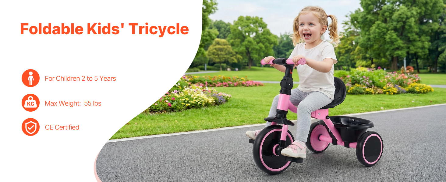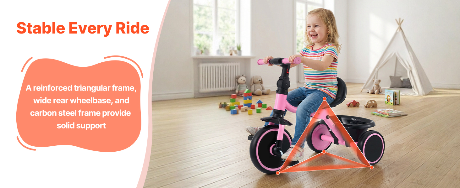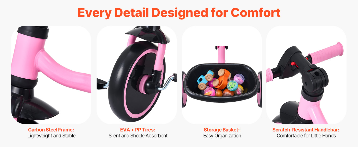 Kolesá z EVA+PP pomáhajú znižovať hluk a absorbovať vibrácie počas jazdy. Okrem toho je trojkolka pre batoľatá vybavená úložným košíkom a držiakom na poháre na prenášanie drobných predmetov.