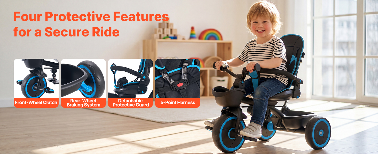 Dvojitý bezpečnostný systém s spojkou na prednom kolese a brzdou na zadnom kolese, plus ochranná lišta a 5-bodový bezpečnostný pás pre dvojitú ochranu – vaše dieťa bude v bezpečí pri každej jazde.