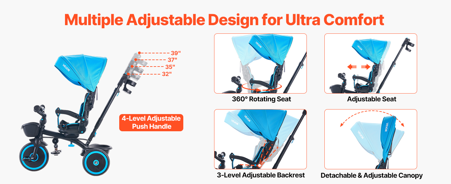 Sedadlo sa dá otočiť o 360° a sedadlo aj operadlo sú nastaviteľné, takže deti rôznej výšky si môžu nájsť pohodlnú polohu na sedenie. Rukoväť na tlačenie má 4 nastavenia výšky pre ľahké a bez námahy tlačenie.