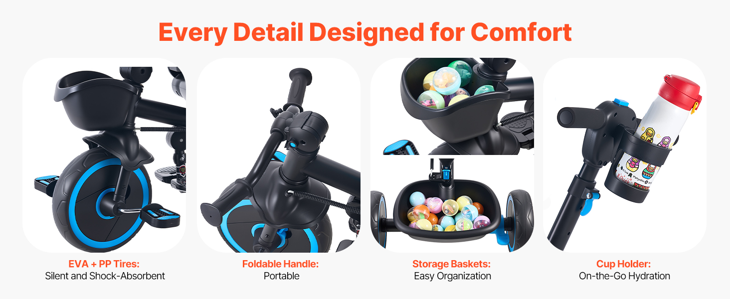 Pneumatiky sú vyrobené z EVA + PP pre tichú jazdu s tlmením nárazov a sú vybavené aj úložným košíkom a držiakom na poháre, aby ste mali drobné nevyhnutné veci vždy po ruke.