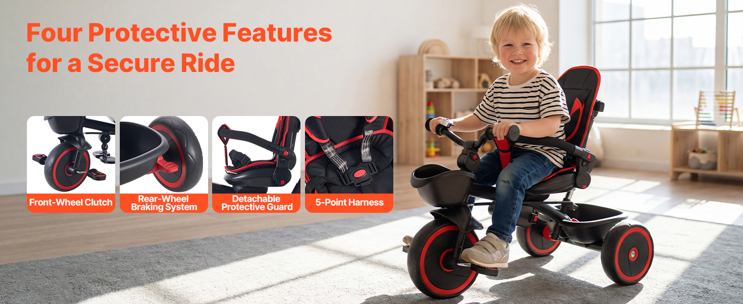 Dvojitý bezpečnostný systém s spojkou na prednom kolese a brzdou na zadnom kolese, plus ochranná lišta a 5-bodový bezpečnostný pás pre dvojitú ochranu – vaše dieťa bude v bezpečí pri každej jazde.