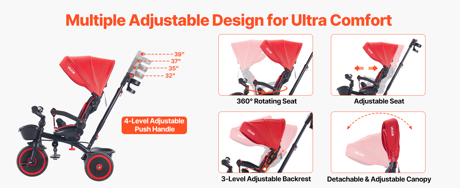 Sedadlo sa dá otočiť o 360° a sedadlo aj operadlo sú nastaviteľné, takže deti rôznej výšky si môžu nájsť pohodlnú polohu na sedenie. Rukoväť na tlačenie má 4 nastavenia výšky pre ľahké a bez námahy tlačenie.