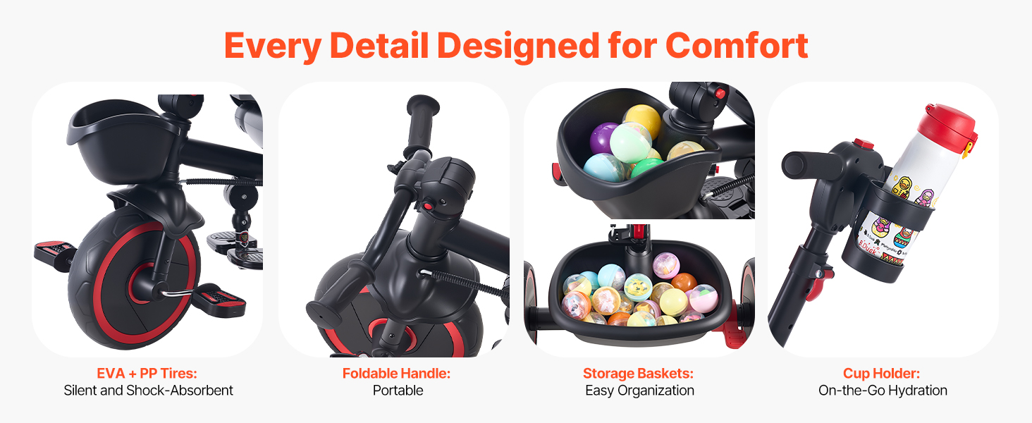 Pneumatiky sú vyrobené z EVA + PP pre tichú jazdu s tlmením nárazov a sú vybavené aj úložným košíkom a držiakom na poháre, aby ste mali drobné nevyhnutné veci vždy po ruke.