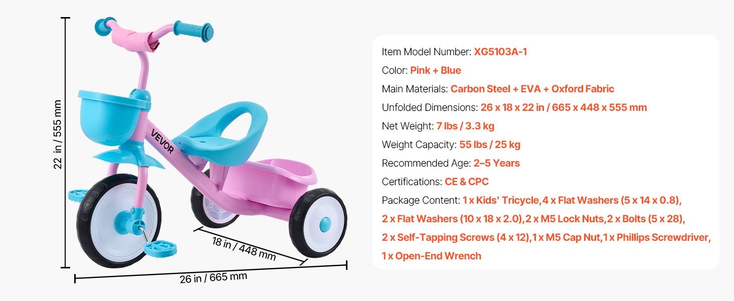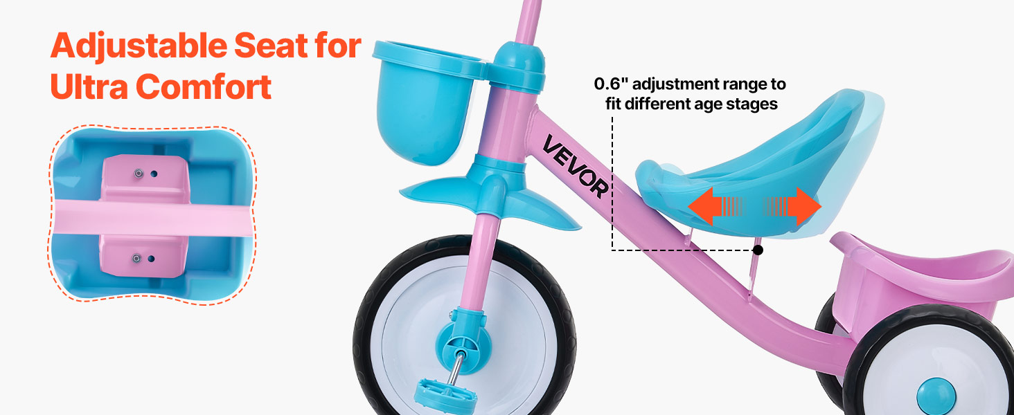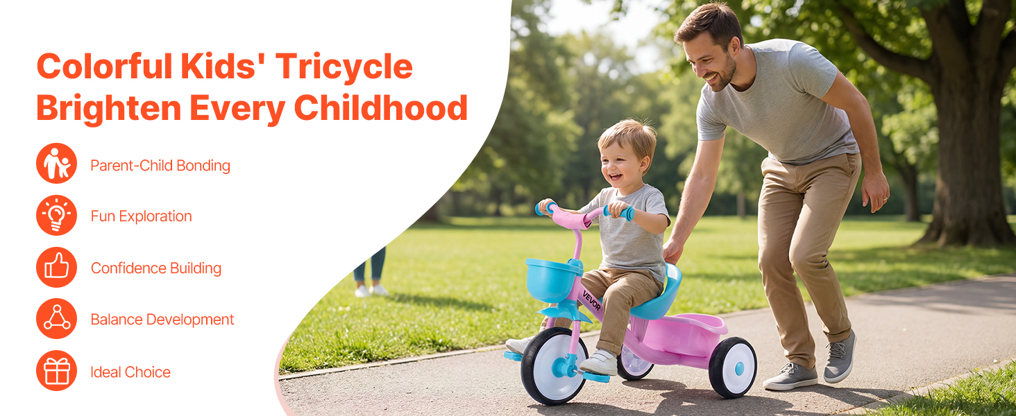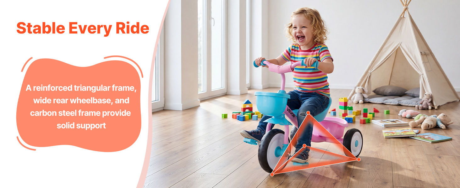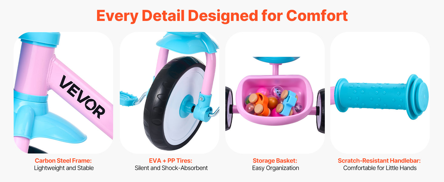Kolesá z EVA+PP pomáhajú znižovať hluk a absorbovať vibrácie počas jazdy. Okrem toho je trojkolka pre batoľatá vybavená úložným košíkom a držiakom na poháre na prepravu drobných predmetov.