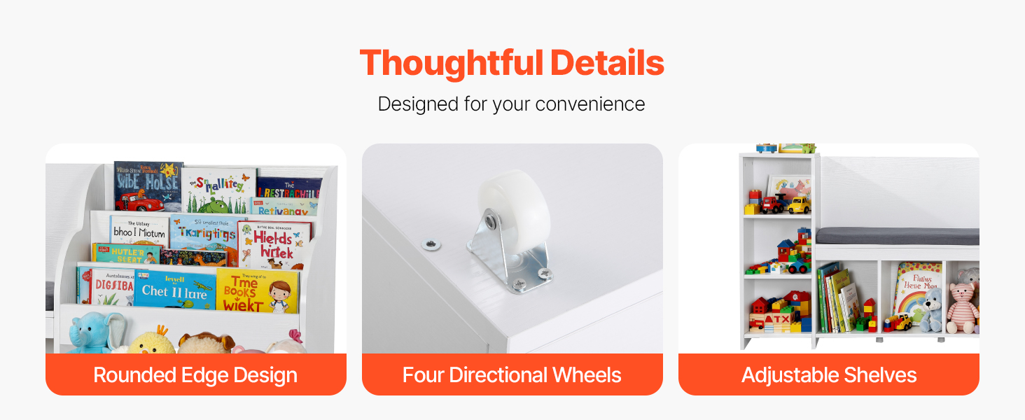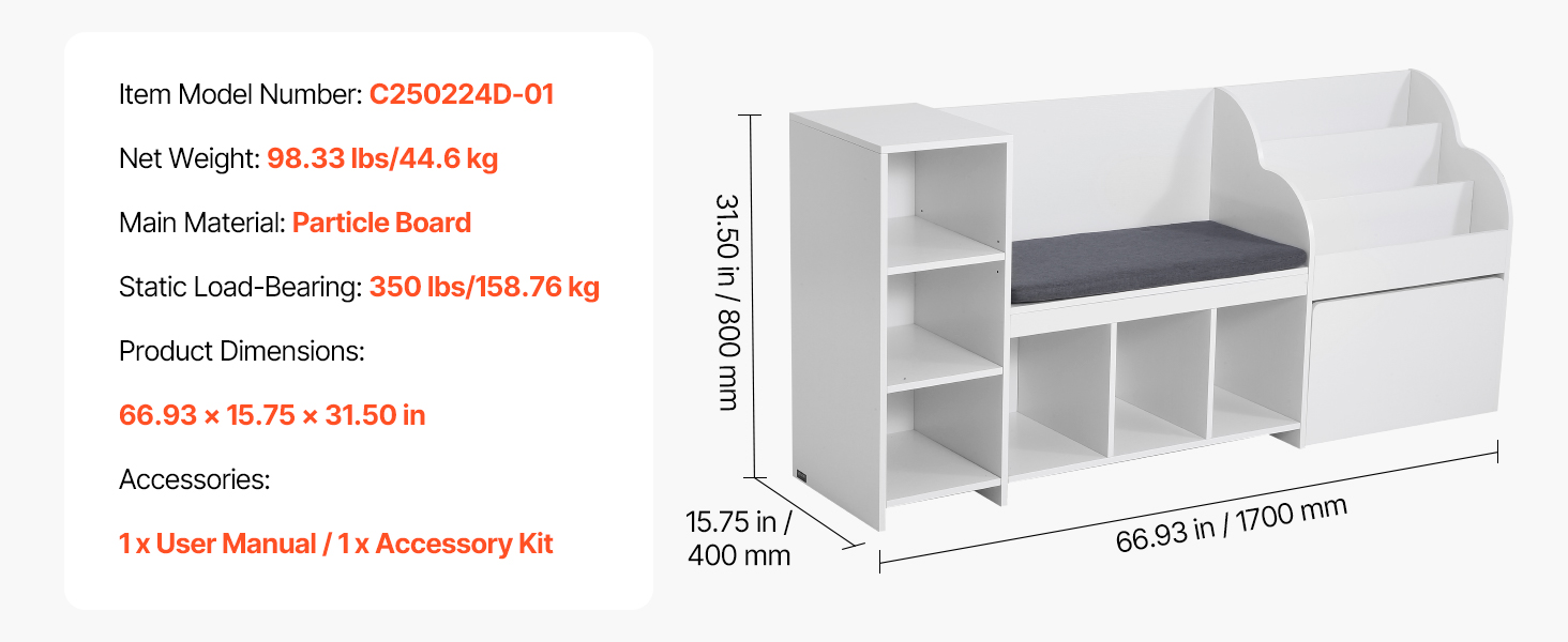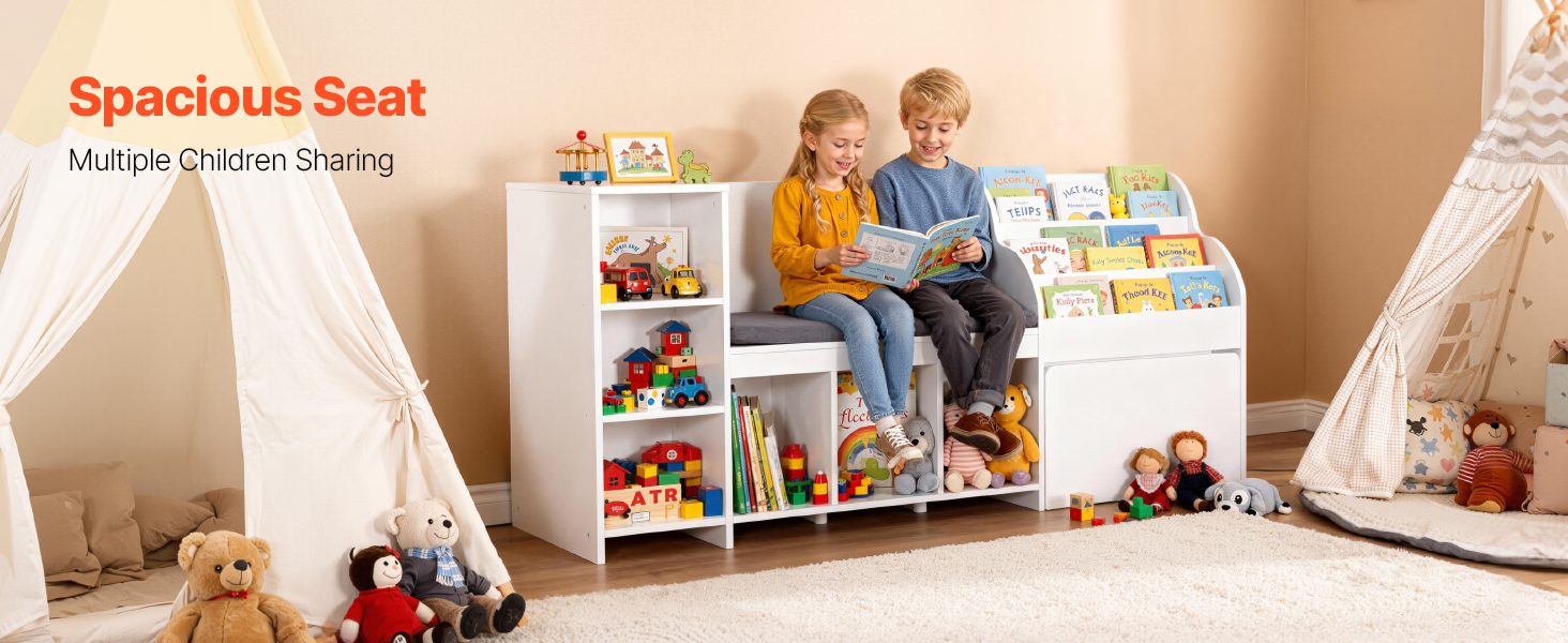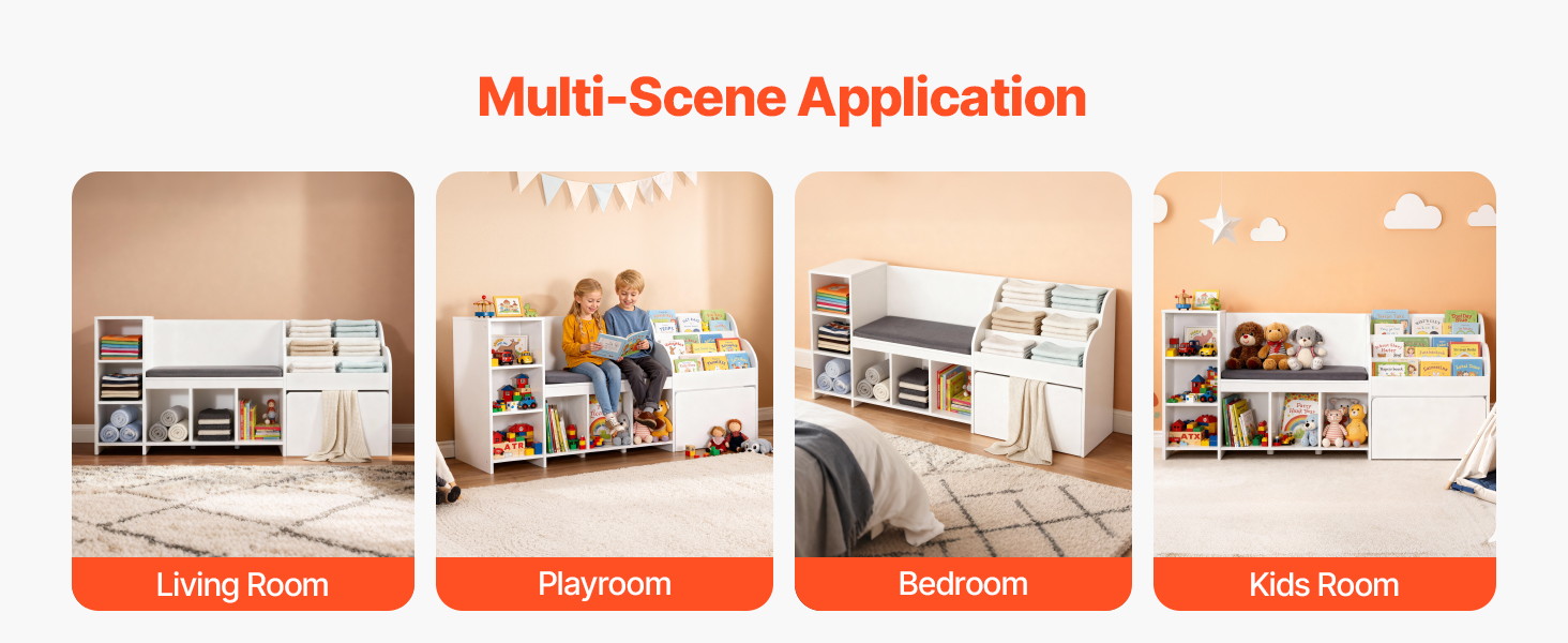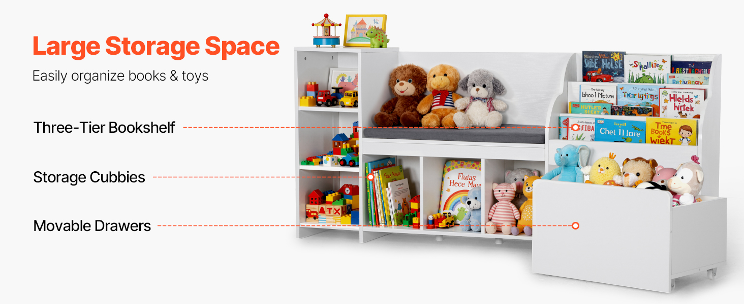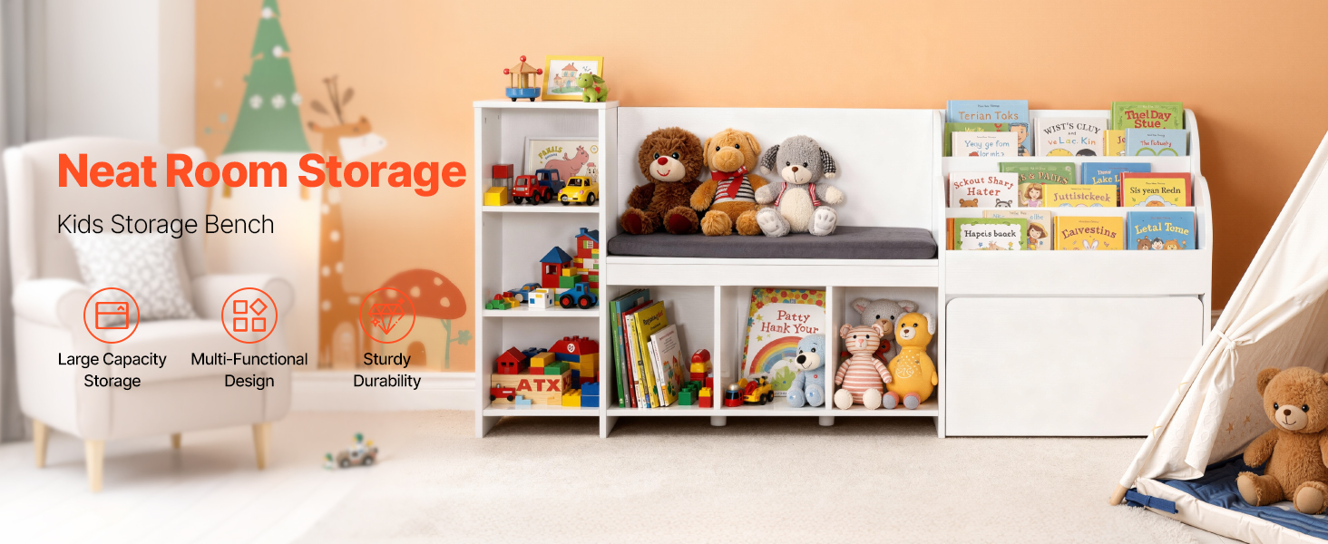 Táto detská úložná lavica kombinuje policu na knihy, úložné priehradky a pohyblivú zásuvku, čím poskytuje veľkokapacitný úložný priestor. Možno do nej ľahko zaradiť hračky, knihy a oblečenie, aby sa v izbe udržal poriadok, a nastaviteľné priehradky umožňujú prispôsobiť priestor podľa rôznych predmetov.