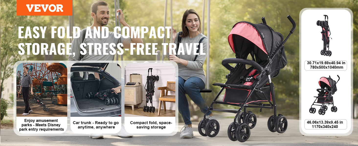 Tento prenosný kočík má skladací dizajn, po zložení je kompaktný, spĺňa požiadavky na vstup do Disney parku a ľahko sa zmestí do kufra vášho auta. Je tiež jednoduchý na uskladnenie doma.