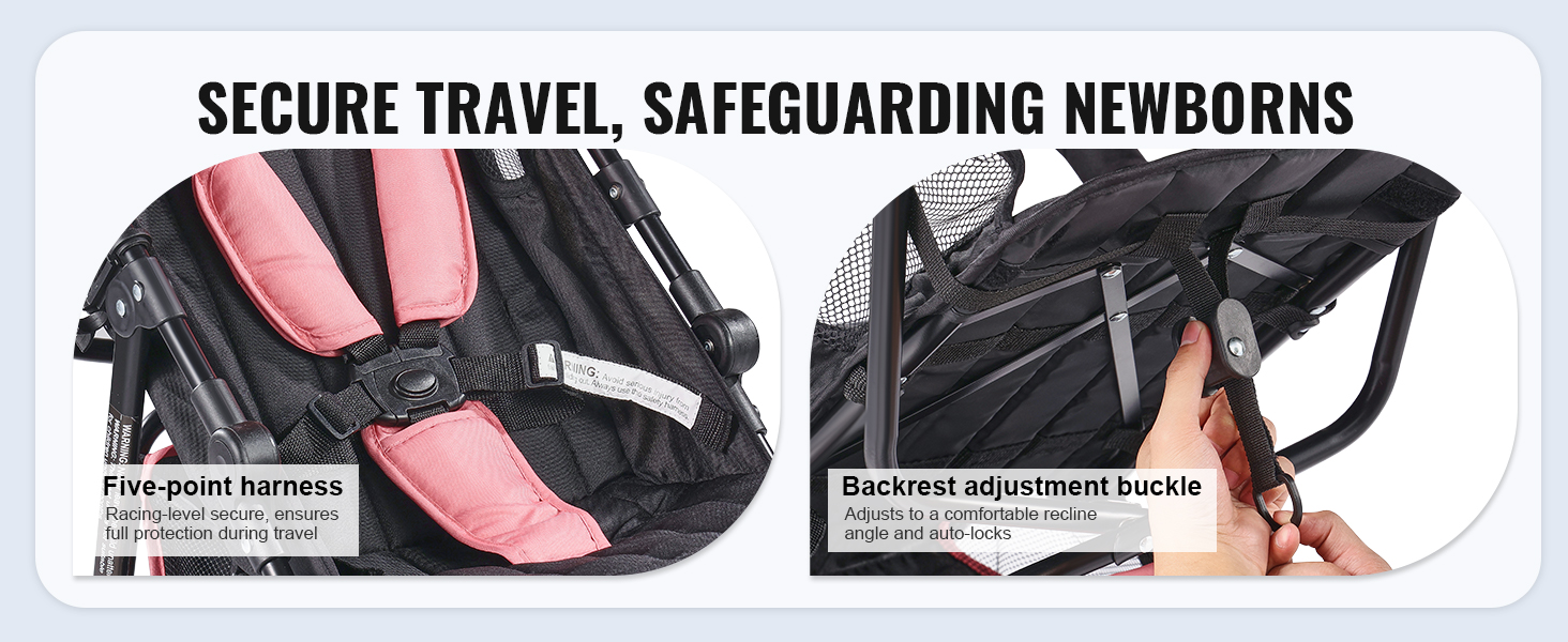 Každý krok na ceste vášho dieťaťa je pre bezpečnosť kľúčový! Tento kočík obsahuje päťbodové bezpečnostné pásy pre ochranu na úrovni pretekov, ktoré zabezpečujú komplexnú bezpečnosť vášho dieťaťa. Spona na nastavenie chrbtovej opierky sa automaticky uzamkne.