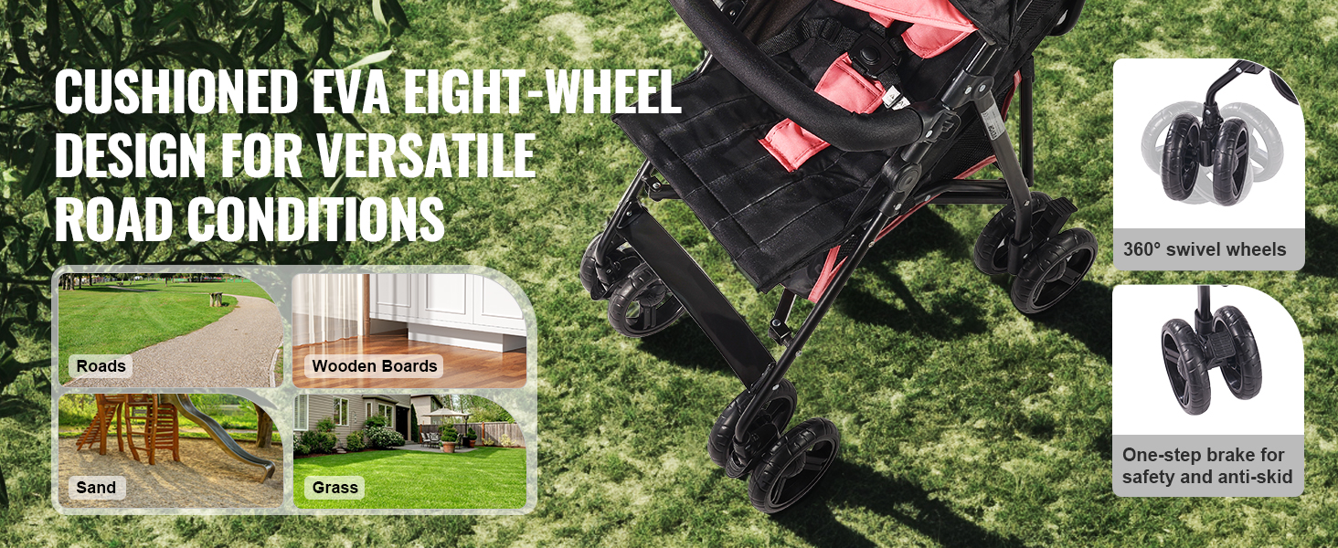 Tento cestovný kočík je vybavený ôsmimi pneumatikami EVA, ktoré pohlcujú nárazy, a ľahko si poradí s rôznymi terénmi. Vďaka kolieskam otočným o 360° sa kočík tlačí bez námahy a brzda ovládaná nohou okamžite zastaví, aby zabránila pretočeniu, čo umožňuje plynulé cestovanie na akomkoľvek povrchu.