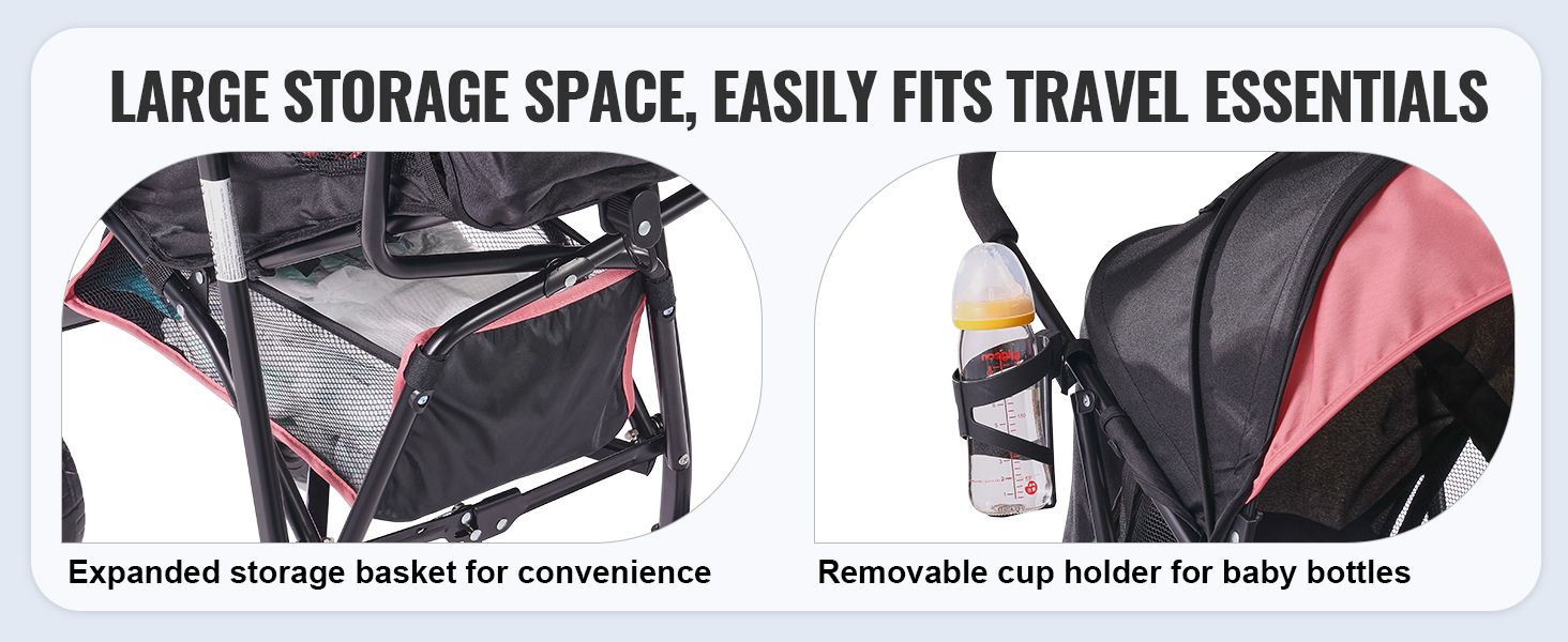 Ľahký detský kočík je vybavený veľkým úložným košom pod ním a odnímateľným držiakom na poháre vedľa rukoväte. Ľahko sa do neho zmestia potrebné veci pre dieťa aj rodiča.