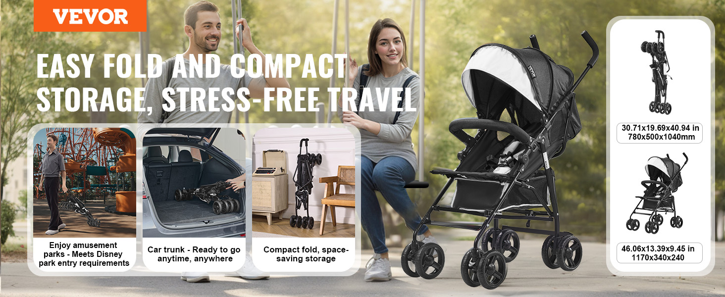 Tento prenosný kočík má skladací dizajn, po zložení je kompaktný, spĺňa požiadavky na vstup do Disney parku a ľahko sa zmestí do kufra vášho auta. Je tiež jednoduchý na uskladnenie doma.