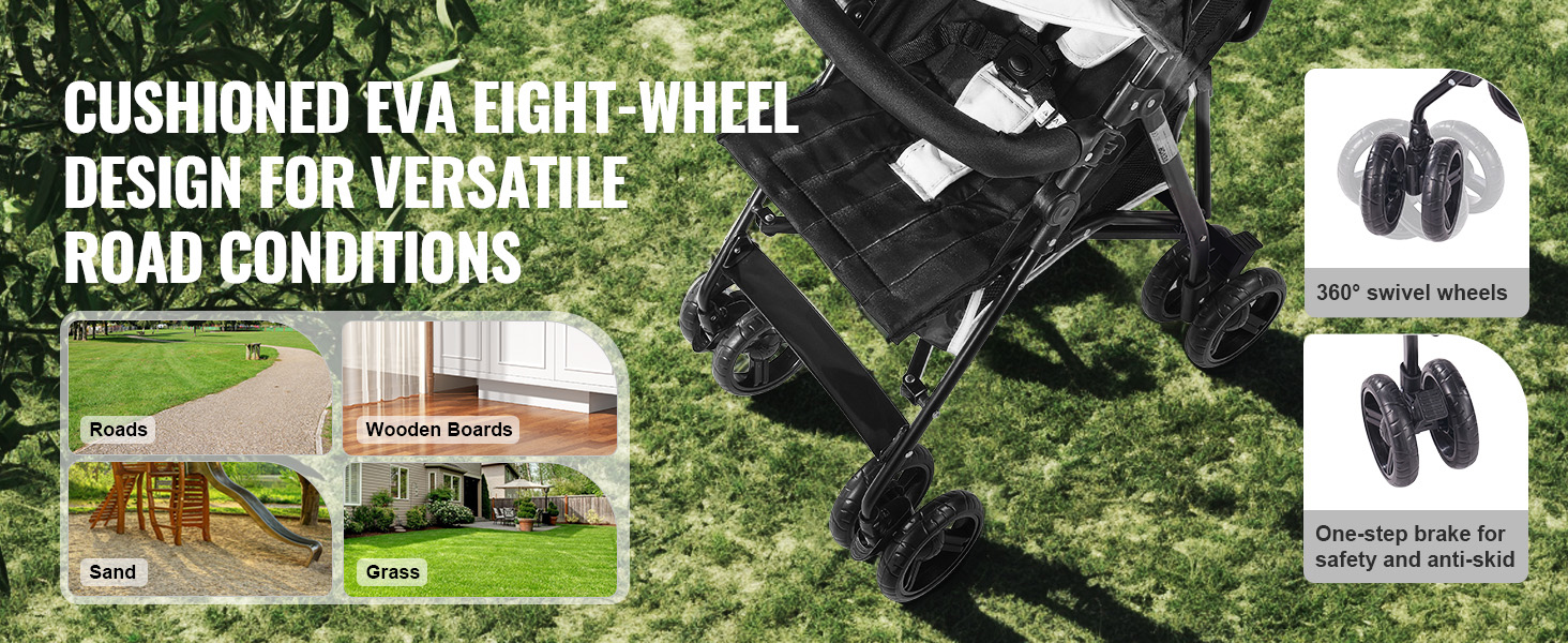 Tento cestovný kočík je vybavený ôsmimi pneumatikami EVA, ktoré pohlcujú nárazy, a ľahko si poradí s rôznymi terénmi. Vďaka kolieskam otočným o 360° sa kočík tlačí bez námahy a brzda ovládaná nohou okamžite zastaví, aby zabránila pretočeniu, čo umožňuje plynulé cestovanie na akomkoľvek povrchu.