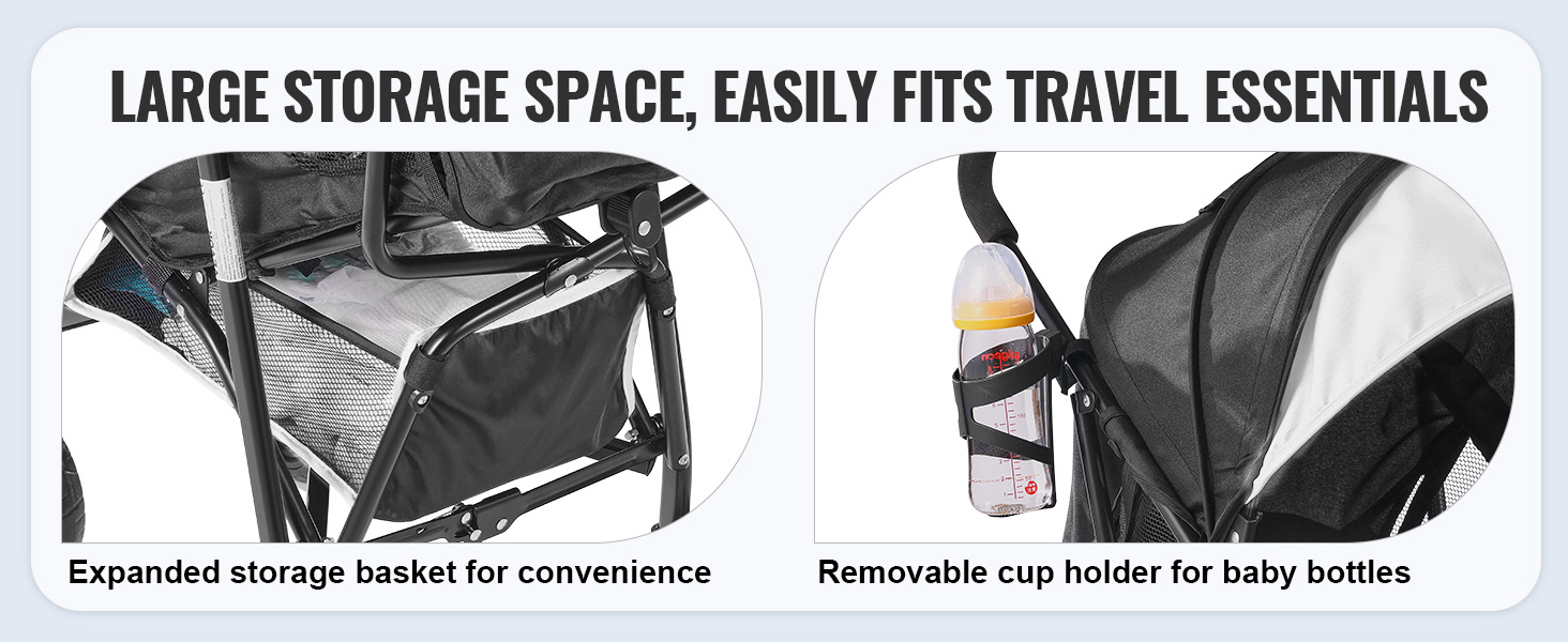 Ľahký detský kočík je vybavený veľkým úložným košom pod ním a odnímateľným držiakom na poháre vedľa rukoväte. Ľahko sa do neho zmestia potrebné veci pre dieťa aj rodiča.
