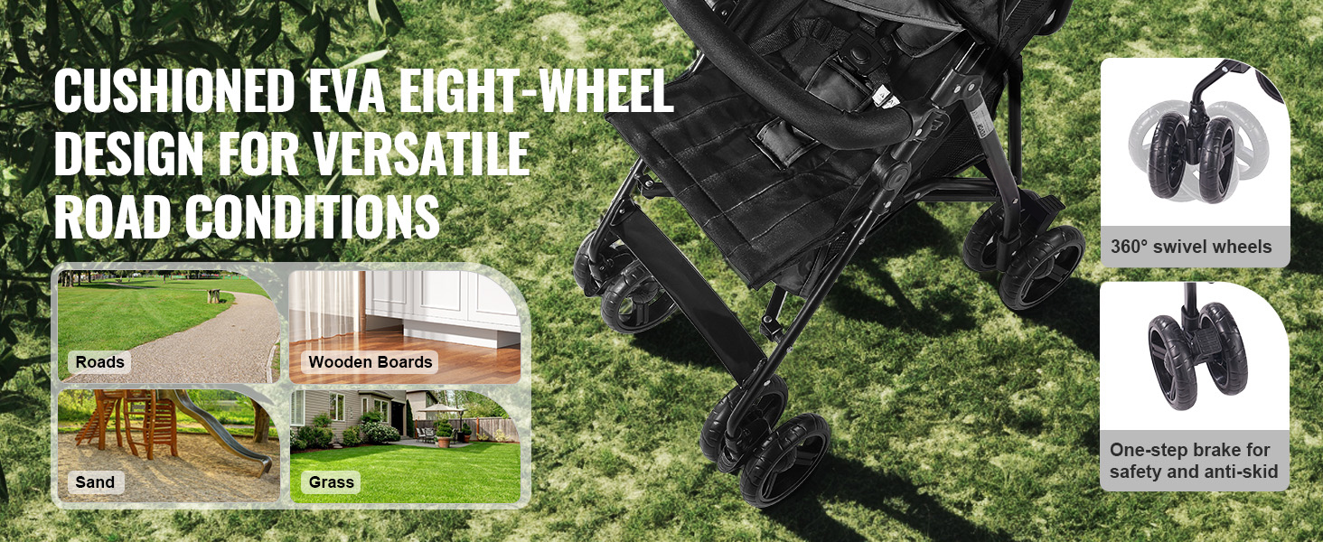 Tento cestovný kočík je vybavený ôsmimi pneumatikami EVA, ktoré pohlcujú nárazy, a ľahko si poradí s rôznymi terénmi. Vďaka kolieskam otočným o 360° sa kočík tlačí bez námahy a brzda ovládaná nohou okamžite zastaví, aby zabránila pretočeniu, čo umožňuje plynulé cestovanie na akomkoľvek povrchu.