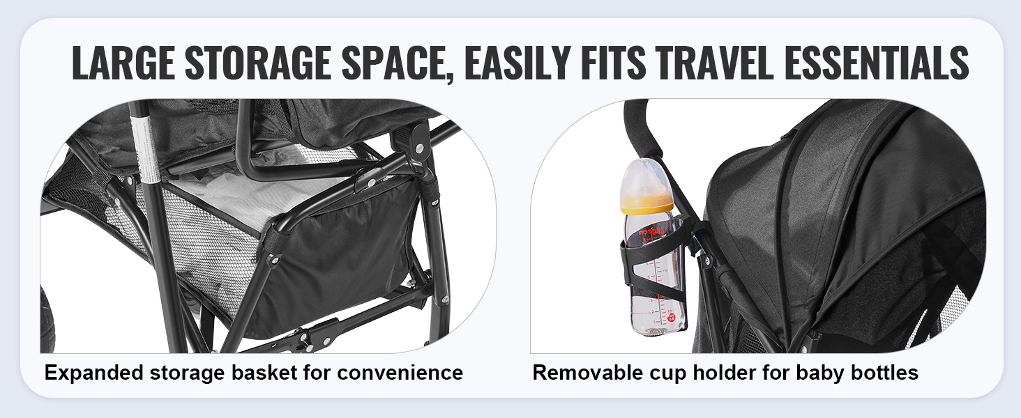 Ľahký detský kočík je vybavený veľkým úložným košom pod ním a odnímateľným držiakom na poháre vedľa rukoväte. Ľahko sa do neho zmestia potrebné veci pre dieťa aj rodiča.