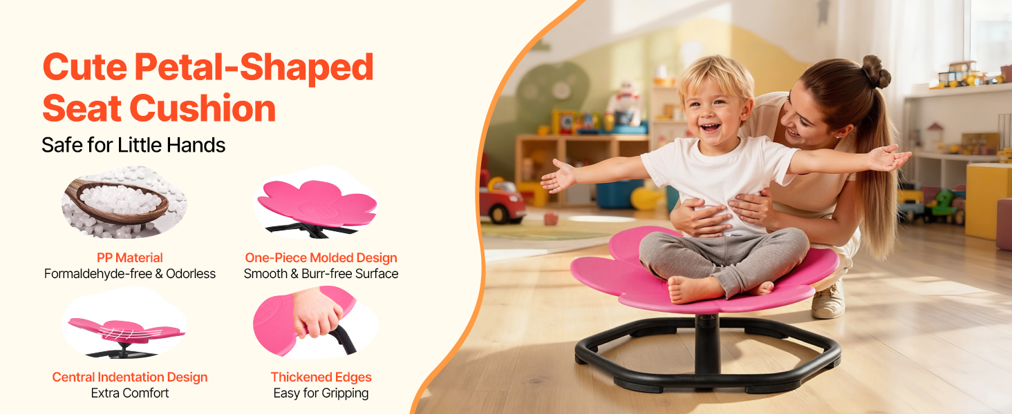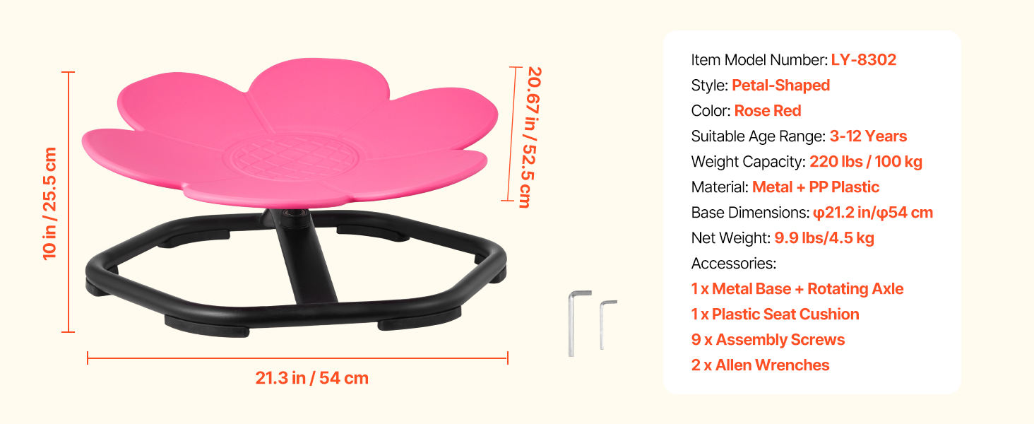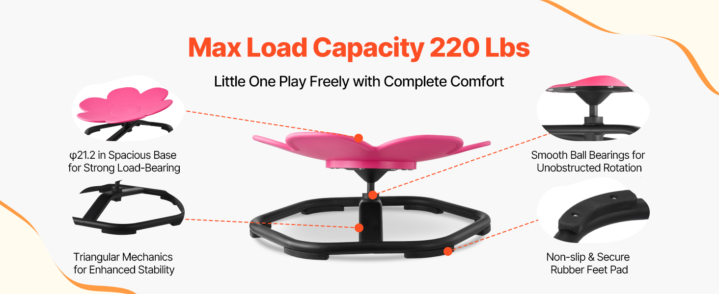 Detská rotujúca stolička s rozšírenou kovovou základňou 21,2 palca/54 cm unesie až 220 libier/100 kg. Jeho trojuholníková konštrukcia s guľôčkovými ložiskami zabezpečuje plynulé otáčanie a protišmykový dizajn zabraňuje skĺznutiu počas hry.