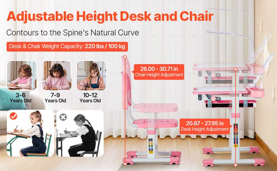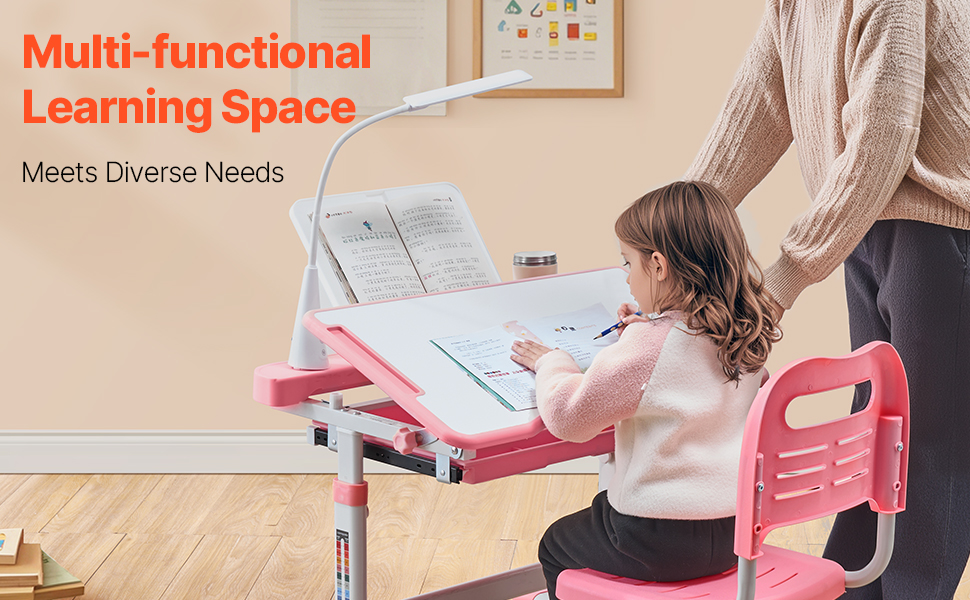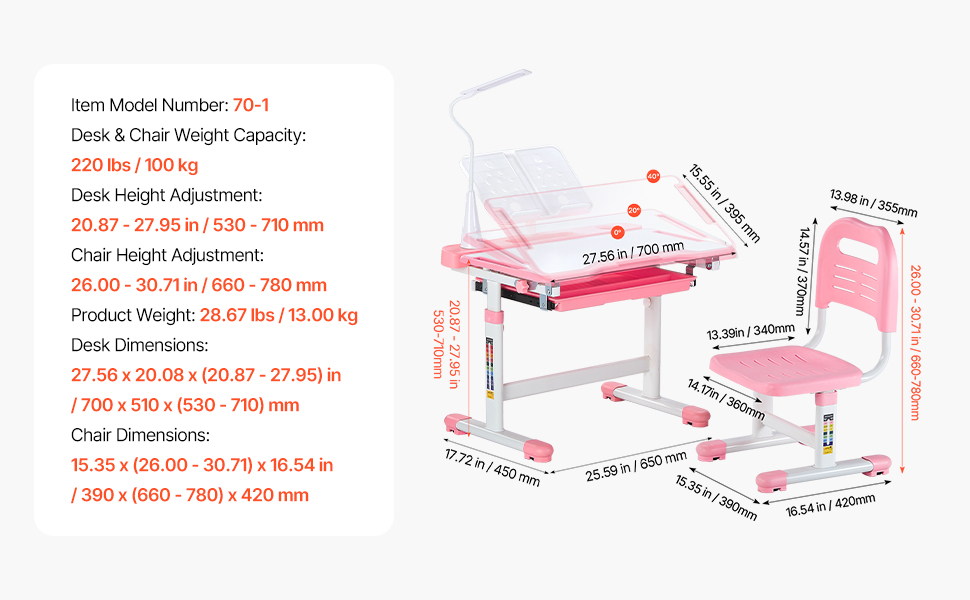 Detský stôl a stolička s lampou, nastaviteľná výška, náklon 0-40°