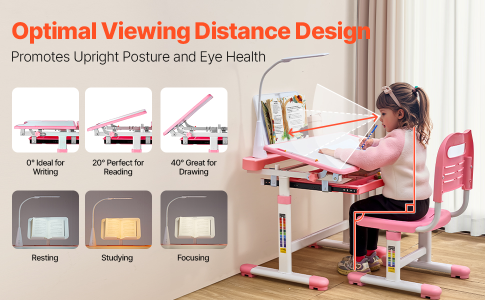 Stolová doska sa dá ľahko nakloniť v rozsahu 0° až 40°, aby vyhovovala písaniu, čítaniu alebo kresleniu. Táto flexibilita sa nielen prispôsobí rôznym činnostiam, ale tiež podporuje vaše dieťa v udržiavaní zdravého a správneho sedenia.
