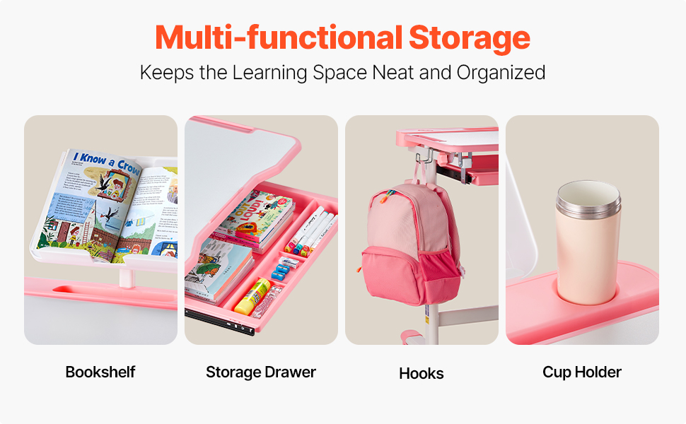 Udržujte študijný priestor svojho dieťaťa prehľadný a organizovaný vďaka zabudovanej zásuvke na odkladanie učebných pomôcok a multifunkčným oceľovým háčikom na boku na zavesenie batohov a fliaš s vodou. Toto inteligentné úložné riešenie vytvára uprataný a pohodlný pracovný priestor, ktorý je ideálny na sústredené učenie.