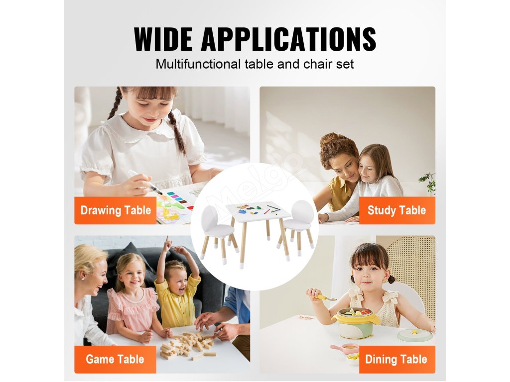 Náš detský stôl a 2 stoličky sú prispôsobené pre deti vo veku 2-8 rokov. Je navrhnutý s ohľadom na ich pohodlie a držanie tela. Ideálny na použitie v obývacích izbách, herniach, denných centrách, čitárňach a detských izbách na tvorenie, hranie, kreslenie, čítanie a občerstvenie.