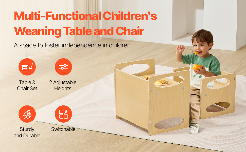 Naša súprava stola a stoličky Montessori na odstavenie dieťaťa funguje ako stabilná stolička a rýchlo sa premení na priestranný stôl, takže je vhodná pre deti všetkých vekových kategórií.