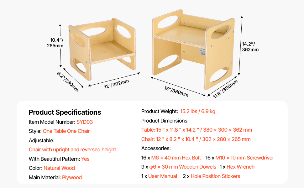Táto súprava stola a stoličky na odstavenie dieťaťa je vyrobená zo silnej preglejky s hladkými hranami pre bezpečnosť. Má zábavný dizajn s dvoma možnosťami výšky: 6.5 palcov / 165 mm a 4,5 palca / 115 mm. Stolík možno ľahko premeniť na stoličku alebo priestranný písací stôl.
