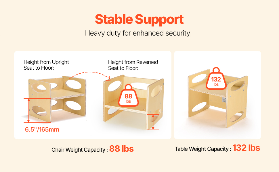 Naša súprava stola a stoličky Montessori na odstavenie dieťaťa poskytuje výnimočnú nosnosť, pričom stôl unesie až 132 libier / 60 kg a stolička až 88 libier / 40 kg, čo zaručuje stabilitu a bezpečnosť detí počas používania.